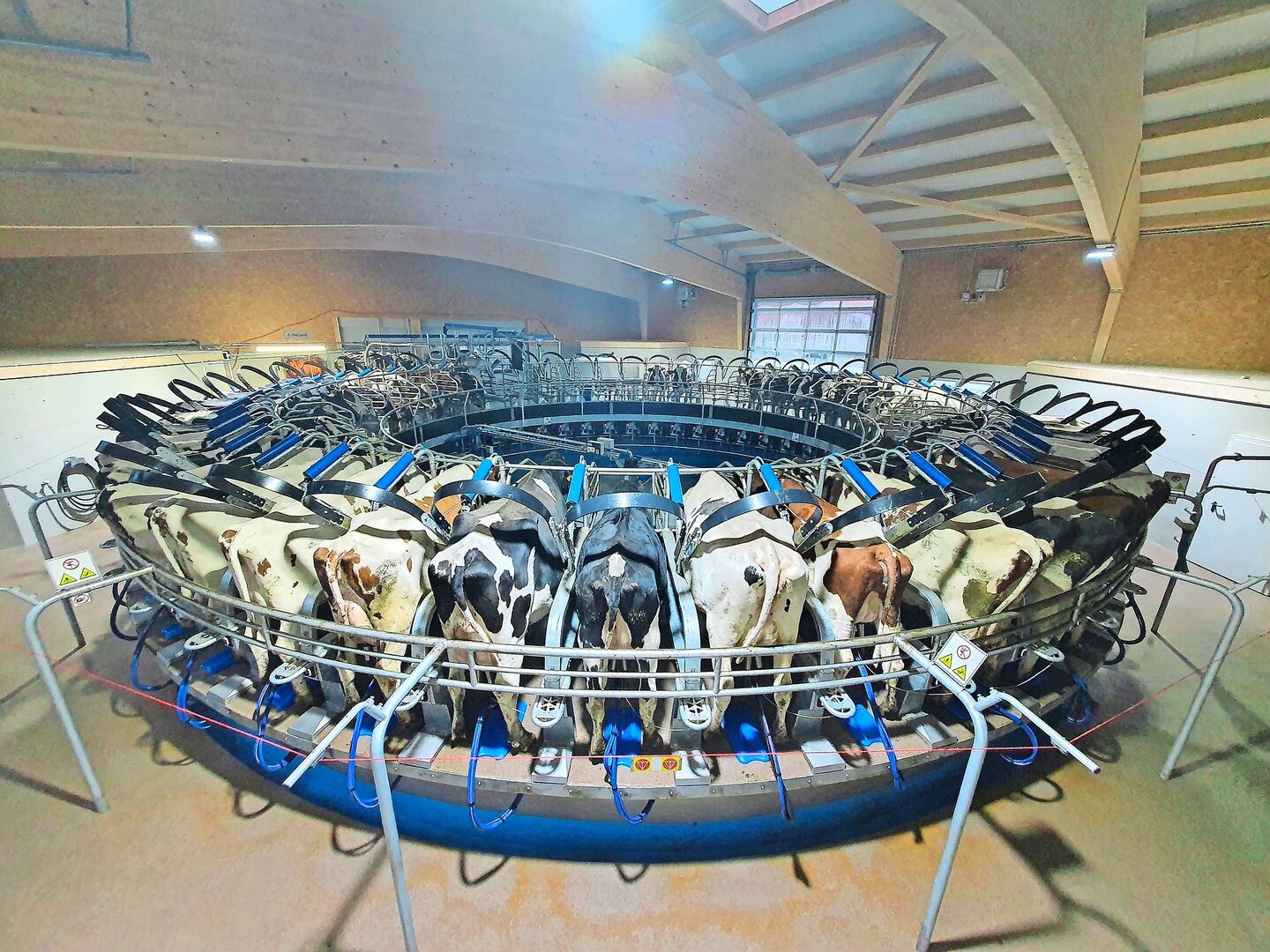 Das Karussell braucht elf Minuten für eine volle Umdrehung, eine Geschwindigkeit, die die Rinder nicht zu stören scheint.Es ist offensichtlich, dass eine solche Anlage eine gewisse Eingewöhnungszeit erfordert. «Wie die Tiere mussten auch wir uns erst daran gewöhnen. Beim ersten Mal brauchten wir dreieinhalb Stunden, um das Melken zu beenden. Jetzt können wir 230 Kühe pro Stunde Melken», berichtet der Landwirt. «Wenn neue Kühe in die Herde kommen, kann es allerdings sein, dass sie sich querstellen und den anderen den Zugang versperren. Aber zum Glück lernen sie schnell», so Menoud.