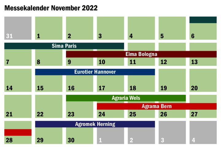 Zur Verdeutlichung: Anfang November 2022 überschnitt sich die Sima in Paris (6. bis 10. Nov.) mit dem Startschuss der Eima in Bologna (9. bis 13. Nov.). Der italienischen Messe folgte die Eurotier in Hannover (15. bis 18. Nov.) auf dem Fusse. Keine zehn Tage nach der Eurotier fand die Agraria im österreichischen Wels statt (23. bis 26. Nov.), fast gleichzeitig wie die Agrama in Bern (24. bis 28. Nov.). Und kaum schlossen sich die Tore der Schweizer Messe, erfolgte der Startschuss für die Agromek im dänischen Herning (29. Nov. bis 2. Dez.).