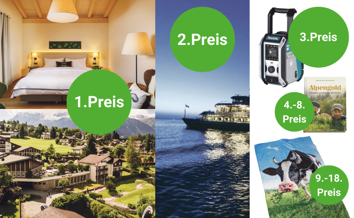 Sonne tanken, die Höhenluft tief einatmen und die herrliche Aussicht auf die Bündner Berge geniessen. Ist Ihr Interesse geweckt? Vielleicht haben Sie Glück und gewinnen unseren Hauptpreis, eine Auszeit im Hotel Sport in der Region Davos-Klosters. Diese Gegend ist nicht nur ein Skiparadies, sondern bietet auch im Sommer perfekten Raum zum Wandern, Mountainbiken und viel Weiteres. Vielleicht zieht es Sie aber eher aufs Wasser? Dann ist unser Preis für den zweiten Platz das Richtige für Sie: An einem Winterabend geniessen Sie ein Fondue auf einem Thunersee-Schiff.
