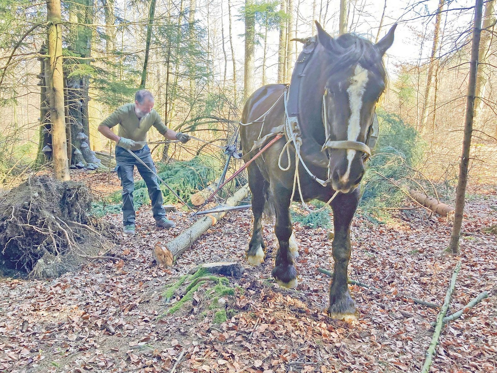 Man muss sie nicht lange im Wald suchen, ihre Glöckchen sind von weitem zu hören: Drei schwere Kaltblutpferde sind zurzeit auf dem Winterthurer Eschenberg im Einsatz. Sie schleppen Stämme und Äste von Nadelbäumen ab, die dem Nassschnee des vergangenen Winters oder den starken Stürmen vom letzten Jahr nicht standhalten konnten. Diese Arbeit muss nun dringend getan werden, um dem Borkenkäfer zuvorzukommen, der sich auf den liegenden Fichten zu verbreiten beginnt, sobald es wärmer wird.