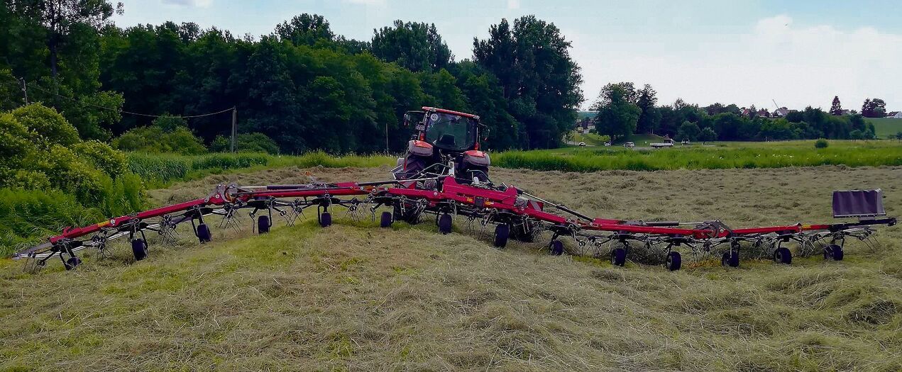 Wer bei der Heuernte grosse, unebene Flächen zu bearbeiten hat, erhält mit dem neuesten Zettwender von Vicon möglicherweise eine Lösung für seine Aufgabe. Der Hersteller, der zur Kverneland-Gruppe gehört, hat im vergangenen Jahr den gezogenen Fanex 1564C auf den Markt gebracht. Die Maschine ist das grösste Modell von Vicon und bietet neben seiner Arbeitsbreite einen zentralen Vorteil: Dank des neuen Bodenanpassungssystems «Terra Flow» folgen die Zinken der Kreisel den Konturen des Bodens.