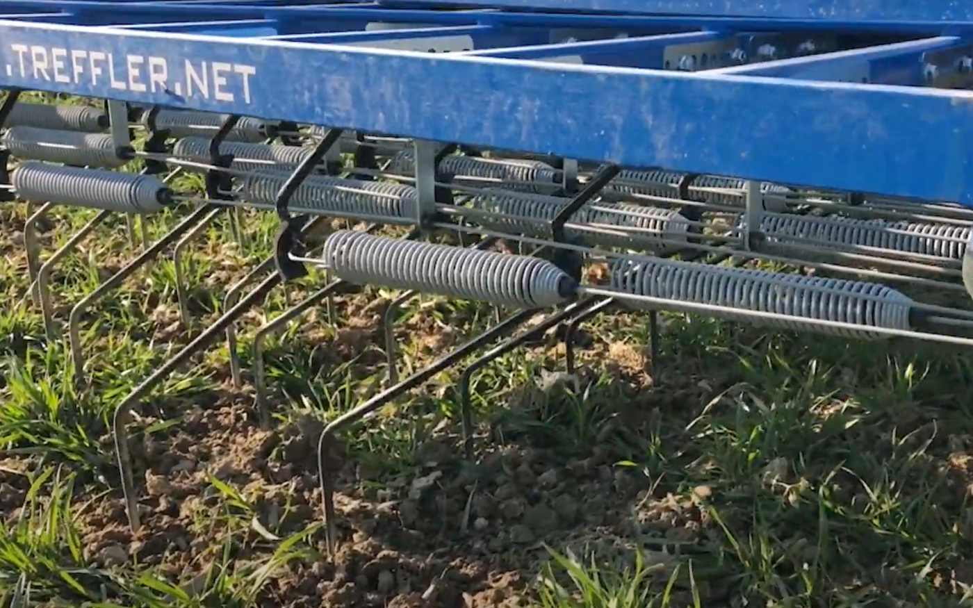 Am Inforama hat man einen Treffler-Präzisionsstriegel vorgeführt. Er verfügt über einen festen Grundrahmen, die Zinken sind einzeln via Seile gespannt und von einer Feder gehalten. Ausserdem sind zwei der sechs Tasträder des Striegels mit 9,2 m Arbeitsbreite und vier Hydraulikzylindern zum Klappen hinten angebracht und schwenken in der Kurve mit. Wichtig sei in der Grundeinstellung, den Rahmen parallel zum Boden auszurichten, hält das Inforama fest. Pro Durchgang mit dem Zinkenstriegel rechnet die DLG mit 1 bis 3 % Kulturpflanzenverluste, das Inforama geht von total etwa 10 % aus – was das Getreide aber kompensiere. Im Fädchen- und Keimblattstadium des Unkrauts ist gemäss DLG ein Wirkungsgrad über 80 % je Durchgang mit dem Zinkenstriegel erreichbar, mit zunehmender Grösse der Pflanzen nehmen aber Ausreiss- und Verschüttwirkung sehr schnell ab. Im Inforama-Versuch kam der Treffler-Striegel dem Klettenlabkraut nicht bei – dieses gilt wegen seiner tiefen Wurzeln als grosses Problem für die mechanische Unkrautbekämpfung und kann kaum mit dem Striegel erfasst werden.