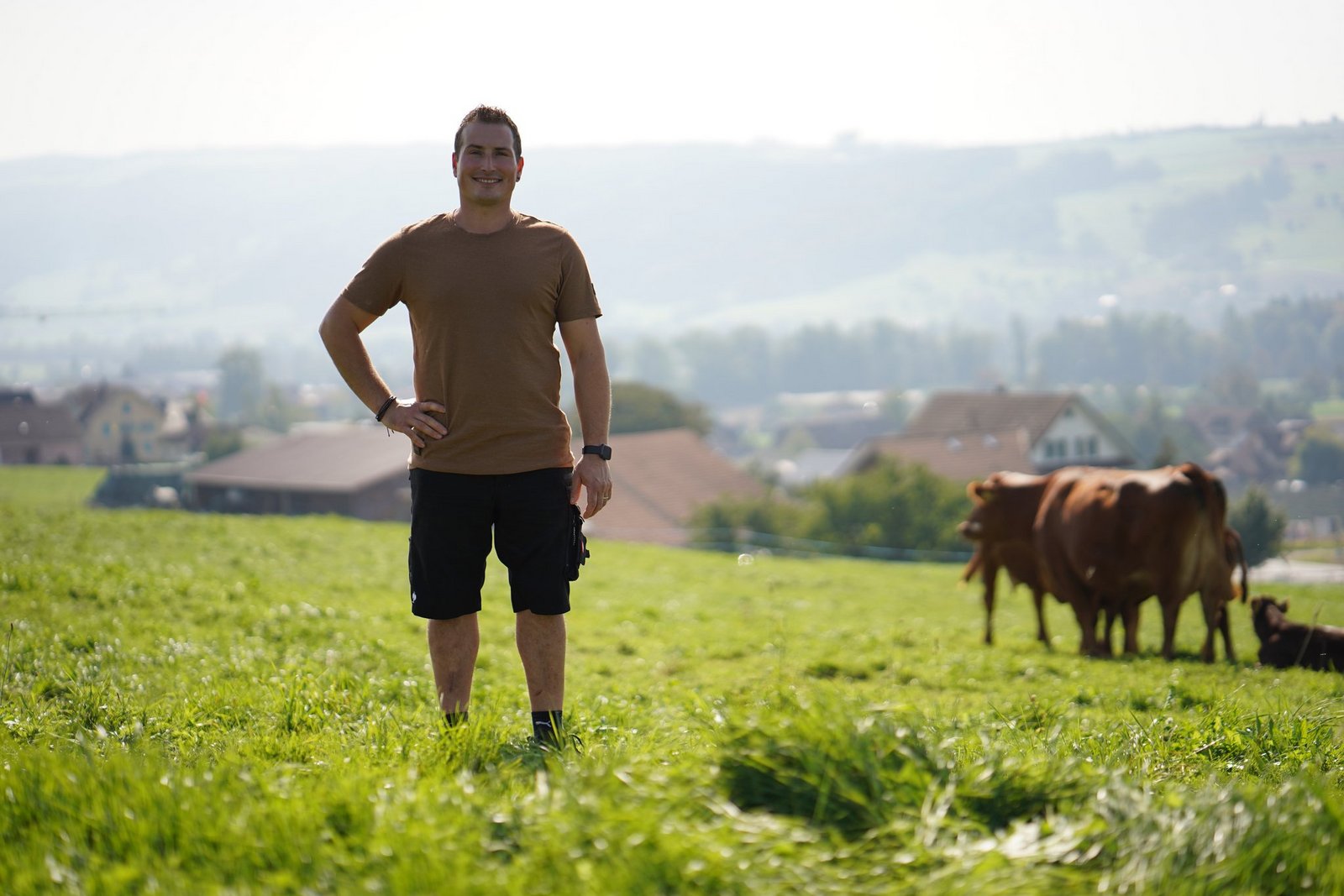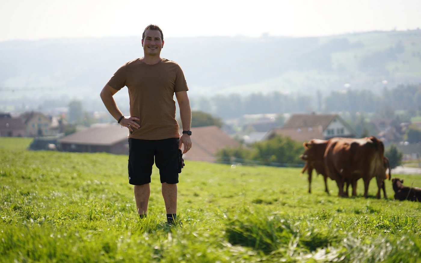 Der Laufstall neben dem Bauernhaus ist gerade leer; die Tiere geniessen die Herbstweide bei bestem Wetter und einer wunderbaren Aussicht auf den Hallwilersee. Rund sechs Hektaren Dauerwiese liegen arrondiert um Tobias Höltschis Betrieb, eine ideale Dauerweide für die 20 Mutterkühe und ihre Jungtiere. «Ich setze auf F1-Tiere, bei denen die Mutter eine Milchkuh und der Vater ein Limousin-Stier ist. So habe ich Muttertiere, die sicher genügend Milch zur Aufzucht der Jungen geben», erläutert der Luzerner.