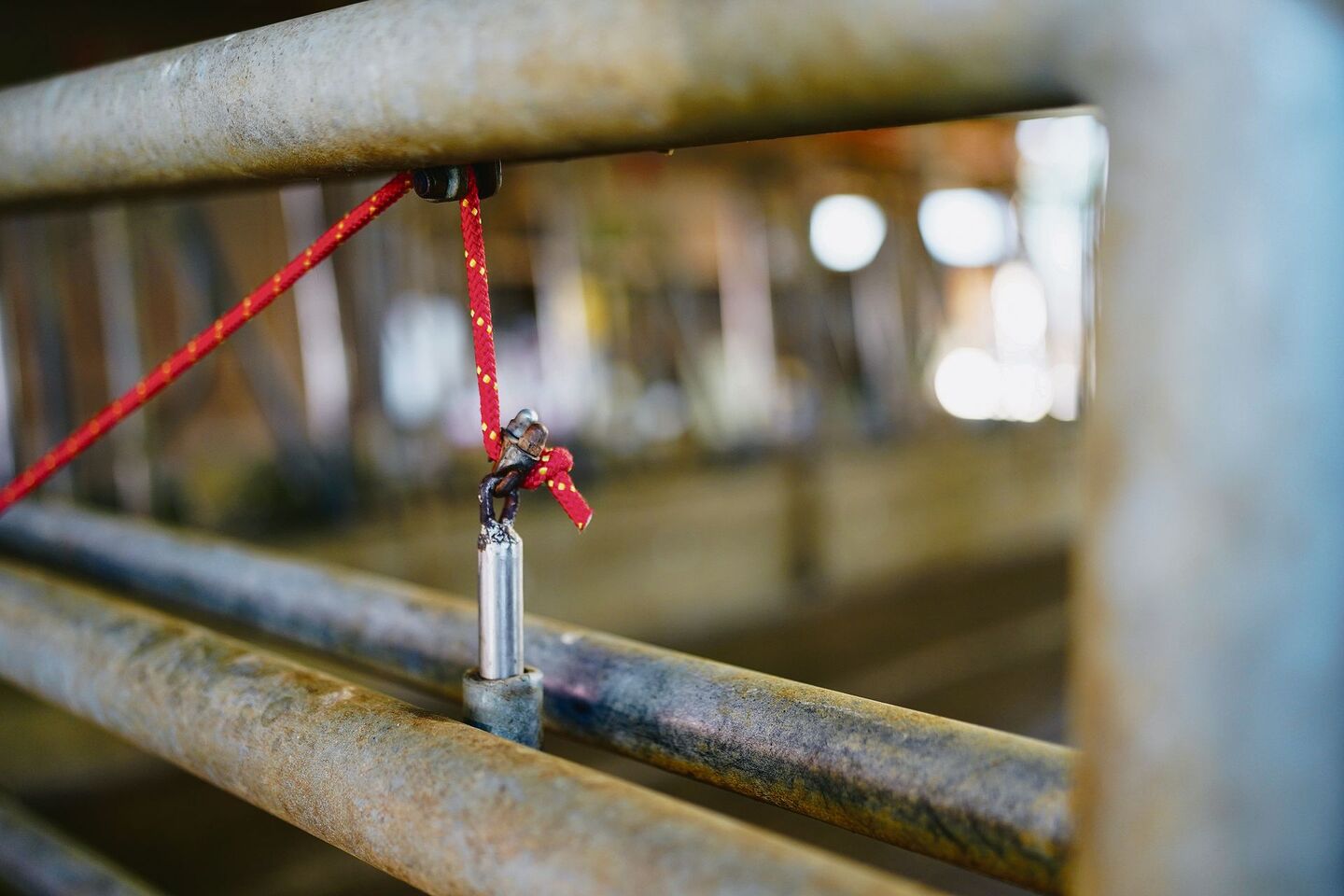 Fixiert wird das Element mit zwei Metallstangen, die in die Bodenspalten versenkt werden. Das Herausheben der Stangen geschieht mühelos mit einem Seilzug und einer Nylon-Schnur. Anschliessend kann Höltschi das perfekt über die Schienen rollende Gatter ganz einfach und alleine verschieben. «Dank des Gatters kann ich alleine arbeiten und stehe nie bei den zu separierenden Tieren in der potenziellen Gefahrenzone», kommentiert er.
