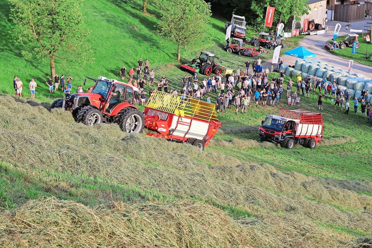 Das zeigte sich auch beim letzten vorgeführten Arbeitsschritt, dem Zusammenführen des Futters. Dabei konnten die Zuschauer während eines herrlichen Sonnenuntergangs einen Aebi Transporter und zwei Ladewagen der Marken Lüönd Swiss Master und Pöttinger im Einsatz sehen. Beide Ladwagen waren mit einer Triebachse ausgestattet, wodurch sie die ansprechende Steigung souverän meisterten.