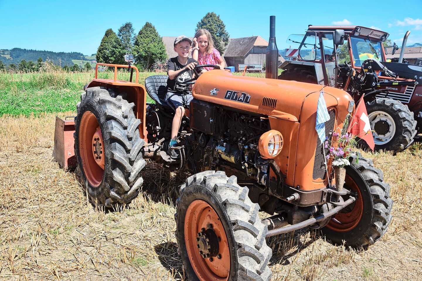 «Ich will einmal Landwirt und Landmaschinenmechaniker lernen», sagt der 10-jährige Johann Aeschlimann bestimmt. Er gehe heute schon oft zu einem Bauern in seiner Nachbarschaft und helfe dort mit. «Die Arbeit mit den Tieren und die Technik mit den Landmaschinen, speziell die der Traktoren, gefallen mir halt schon sehr», so der Bub. Und schon steigt Johann wieder auf den alten Fiat-Traktor seines Vaters. «Schau, hier ist der Hebel für den Allradantrieb. Und weisst du, dieser Traktor mit Jahrgang 1964 hat schon vier Zylinder und er gehörte meinem Grossvater.»