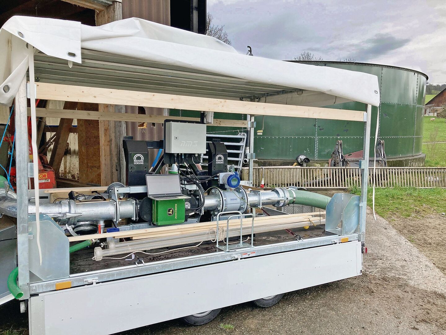 Die mobile Nirs-Station kann am Gülletankwagen oder an einer Pumpstation befestigt werden und agiert dort als Zwischenschaltung. Sobald die Gülle gefördert wird, misst der Sensor die Gehalte an Stickstoff, Ammonium, Phosphor und Kali kontinuierlich in Echtzeit. Die vorbeifliessende Gülle wird durch ein Fenster in der Rohrleitung mit nahinfrarotem Licht bestrahlt. Die unterschiedlichen Nährstoffe reflektieren oder absorbieren das einfallende Licht. Der Sensor erfasst die dabei entstehenden Reflexionen und leitet sie zum Abgleich mit hinterlegten Daten bzw. mit vom Hersteller entwickelter Kalibrierung weiter.