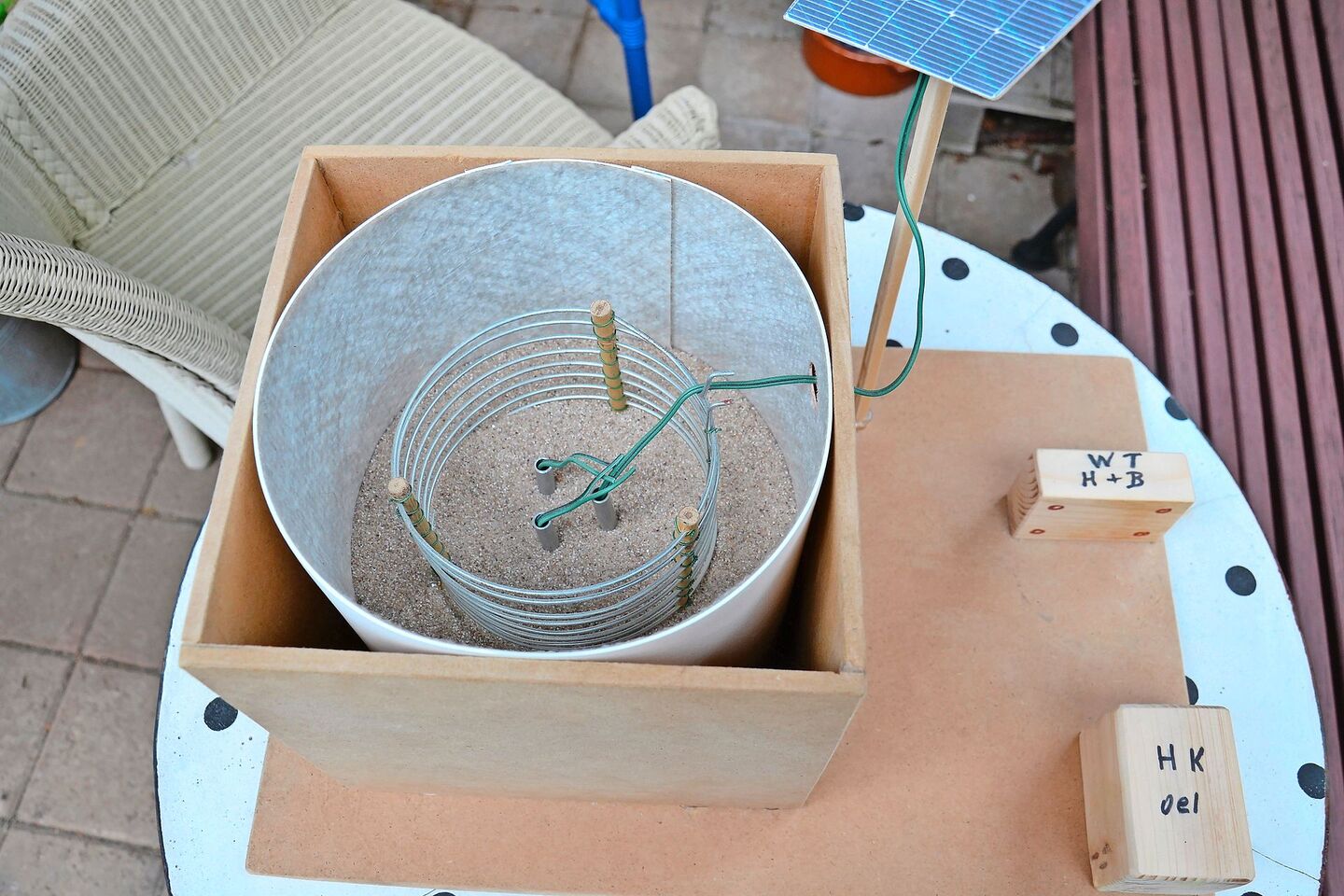Das Resultat seiner Arbeit – und viel Nachdenken in schlaflosen Nächten – besteht aus einfachen Komponenten und speichert die Solarenergie von acht Panels auf dem Dach als Wärme. «Ich habe ein altes Ölfass mit 200 Liter Sand gefüllt», erklärt er den Aufbau. Im Innern verlaufen in drei Hohlziegeln 20 Meter Widerstandsdraht, das Herzstück des Wärmespeichers. «Der Solarstrom fliesst ohne Wechselrichter in die Heizdrähte», so Robert Hofer.[IMG 2]