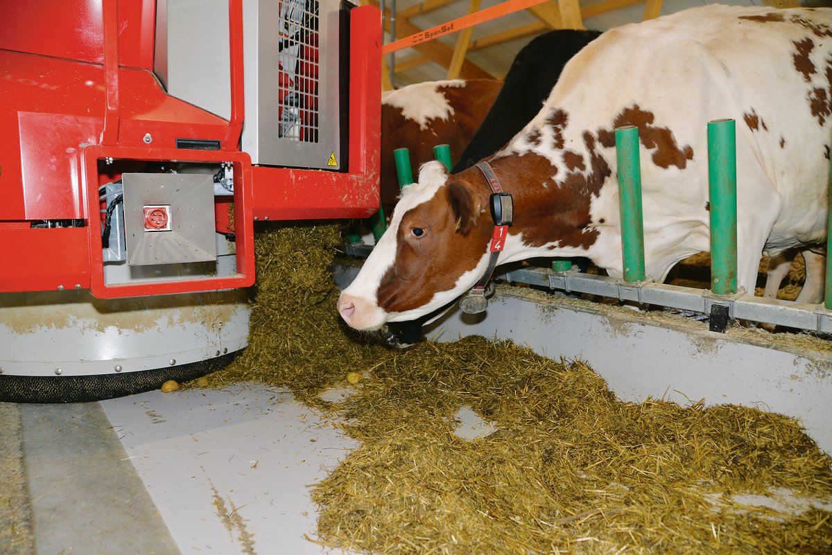 Das Füttern von Milchkühen ist in der Regel eine arbeits- und zeitintensive Tätigkeit. Anders mit einem Roboter: Ein Bauer muss dann lediglich die einzelnen Futterkomponenten in einen stationären Mischer füllen, den Rest erledigt die Maschine. Beim Fütterungsroboter läuft alles vollautomatisch ab. Er holt die Komponenten, mischt, fährt in den Stall, dosiert aus, schiebt regelmässig nach und misst dabei, ob noch genügend Futter vorhanden ist. Bei seinen Fahrten in die Futterküche und zurück in die Ställe wird er mittels Sensoren, die sich im Boden befinden, geleitet.