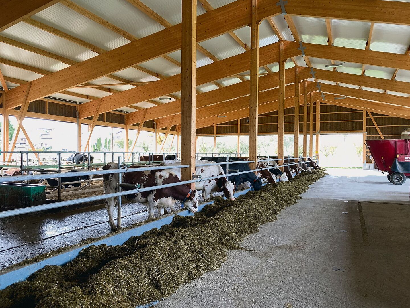 Derzeit sind es 42 Kühe im neuen Stall, wöchentlich werden es mehr. «Wir sind laufend am Aufstocken durch Zukäufe und wir stellen von Braunvieh auf Rot- und Schwarzfleckvieh um.» Der Stalldurchschnitt liegt bereits bei 9000 kg Milch, «Tendenz steigend, dank dem Melkroboter, der Technik und der Genetik». Gefüttert wird eine TMR ab Mischwagen, Ergänzungsfutter gibt es beim Roboter. Im neuen Stall steht das Tierwohl im Zentrum. Die Kühe seien viel ruhiger geworden, lassen sich gerne Melken, die Leistung steige. «Das ist ein gutes Zeichen.»