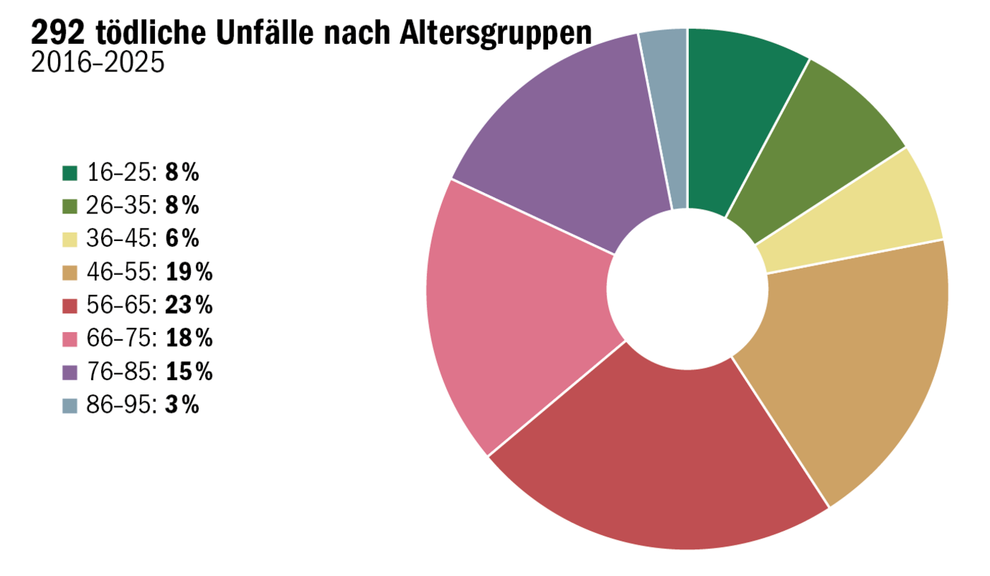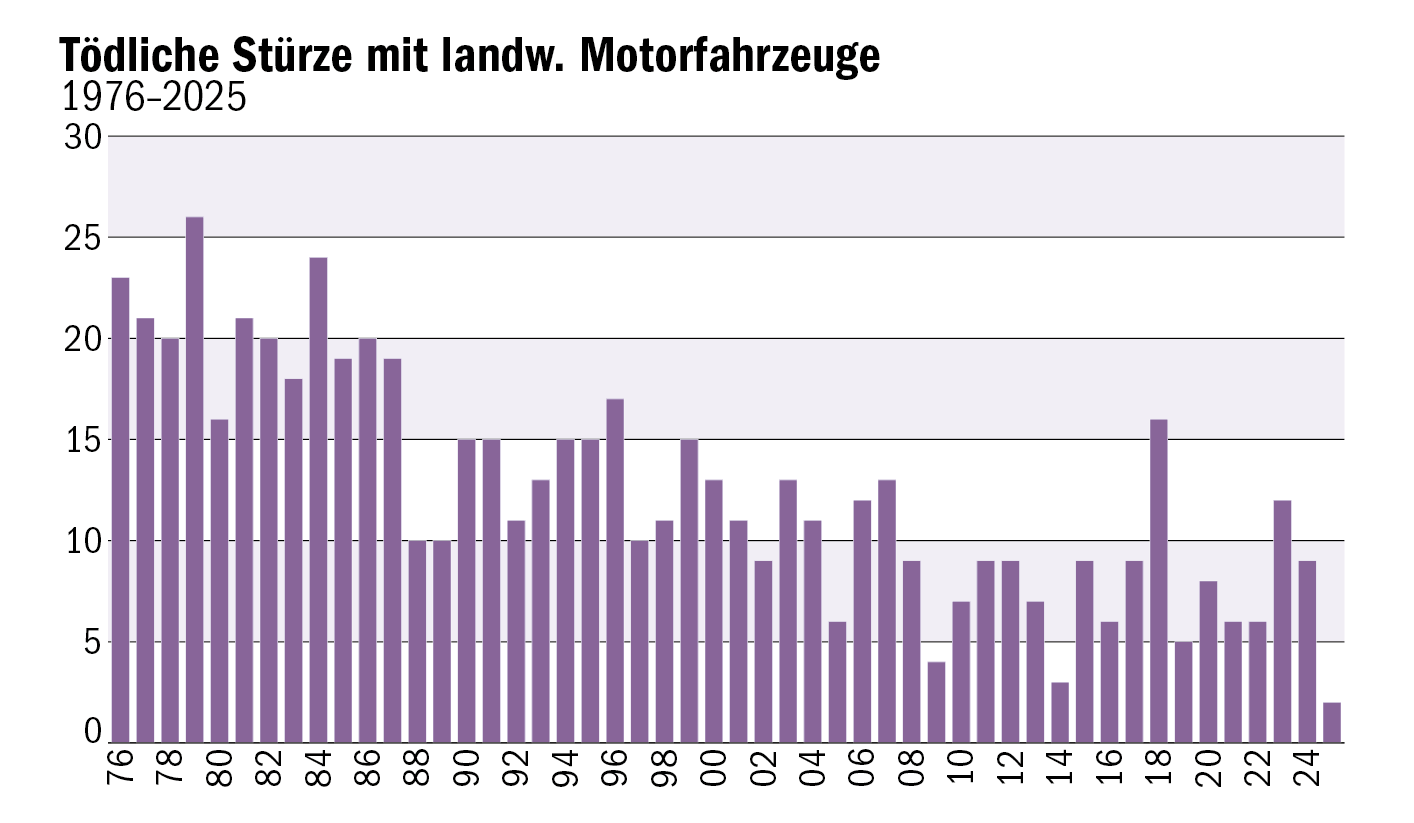 Doch 22 Tote in einem Jahr, das sind immer noch fast zwei pro Monat. Und bei den Maschinenunfällen ist kaum Entspannung in Sicht. Auffällig beim Blick auf die Motorfahrzeugunfälle: Tödliche Stürze mit landwirtschaftlichen Motorfahrzeugen sind über die Jahrzehnte massiv zurückgegangen. Wurden in den 1970er und den 1980er Jahren noch regelmässig über 20 Personen pro Jahr durch Fahrzeugsturz getötet, waren es 2025 nur noch zwei. Hier haben Sicherheitskabinen und Gurttragepflicht viel bewirkt.