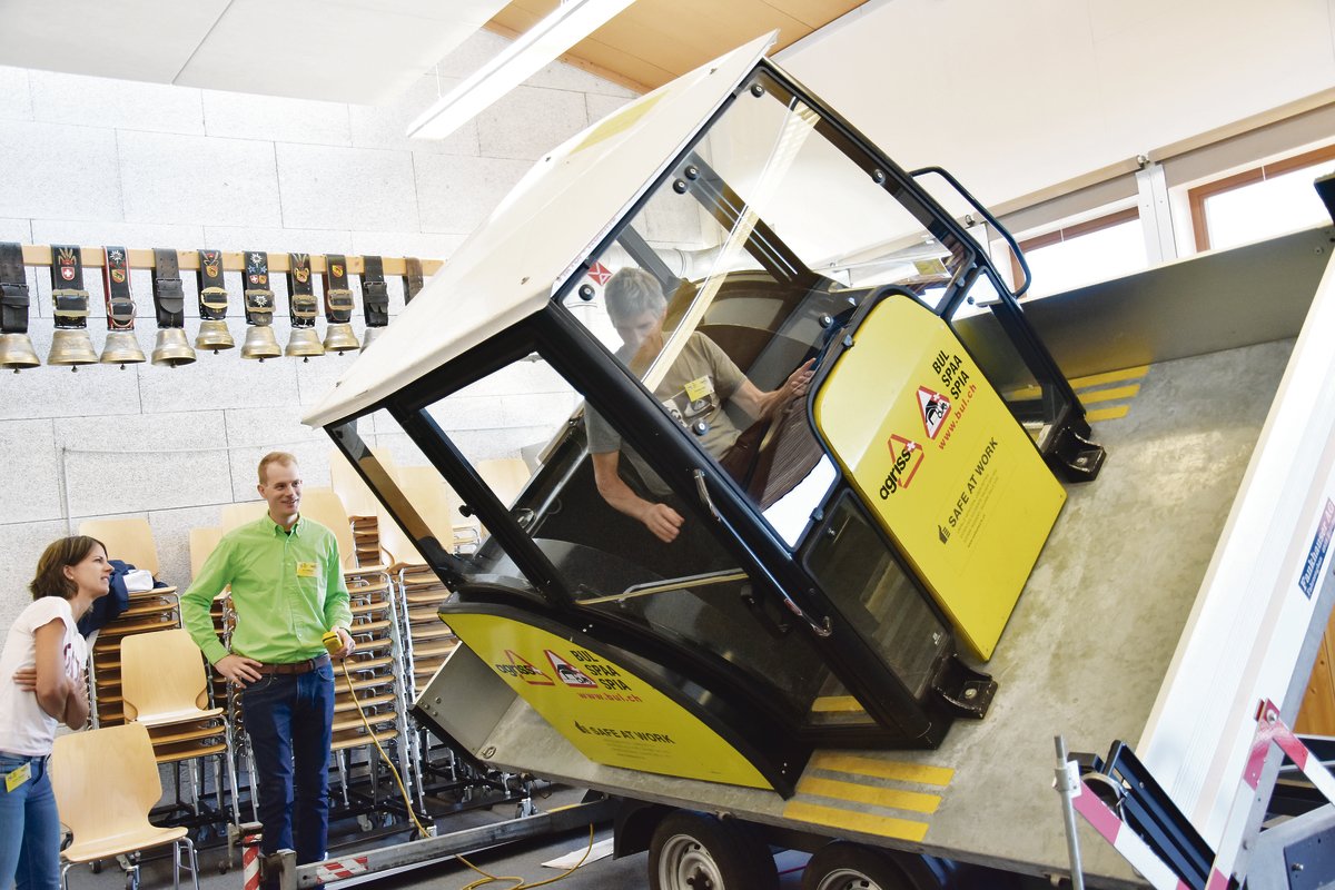 Beim Posten Kipp-Kabine ging es um das Fahren am Hang. Jeder Teilnehmer konnte sich in die Kabine setzen, ohne sich anzugurten. Dann liess ein Betreuer die Kabine hoch, bis man sich ohne den Gurt nicht mehr sicher fühlte.