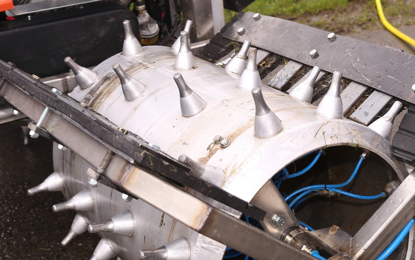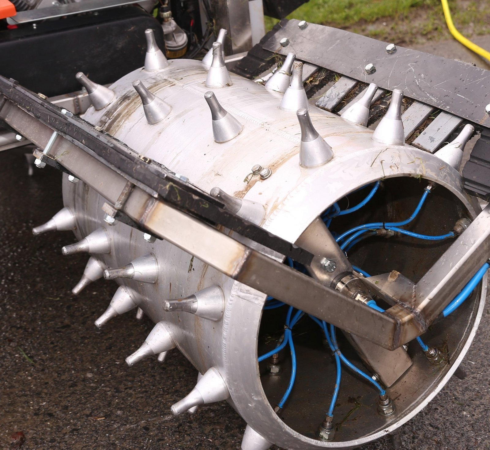 Der landwirtschaftliche Lohnbetrieb Zgraggen aus Erstfeld suchte aus diesem Grund eine praxisreife Lösung für die Engerlingsbekämpfung an Steilhängen und fand diese beim österreichischen Unternehmen Terratec Maschinenbau GmbH. Die Grundmaschine ist ein Motormäher des Typs Terratec Ibex G2. Nach den ersten Einsätzen wurde das Gerät gemeinsam weiterentwickelt und im letzten Frühjahr der breiten Öffentlichkeit präsentiert. Die Stacheln der beiden Walzenräder sind mit je einem kleinen Loch ausgestattet, über welches mittels Pumpen die Flüssigkeit mit den Beauveria-Pilzsporen rund fünf Zentimeter tief in den Boden appliziert wird.