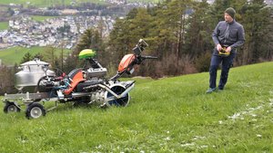 Während auf flacheren Parzellen die Bekämpfung des Engerlings schon seit Jahren mittels der Applikation von Pilzgerste mit Traktor und Sägerät erfolgt, fehlte für die Bekämpfung in steilerem Gelände bis vor Kurzem noch die entsprechende Gerätschaft.