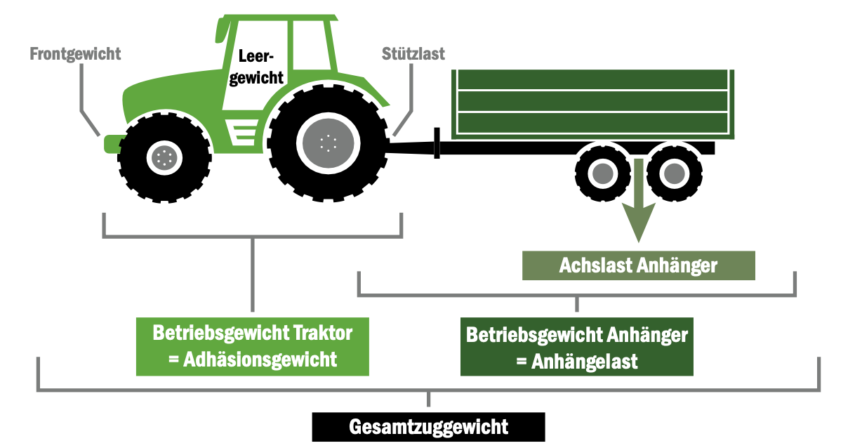Seit dem 1. Februar 2019 muss das Gewicht auf den Antriebsachsen («Adhäsionsgewicht») gemäss Verkehrsregelnverordnung VRV 67 Abs. 4 mindestens 22 Prozent des Betriebsgewichts (aktuelles Gewicht von Traktor und Anhänger) betragen. Die «Adhäsionsgewicht»-Vorschrift gilt für landwirtschaftliche Fahrzeugkombinationen mit einer bauartbedingten Höchstgeschwindigkeit über 25 km/h bis 40 km/h.