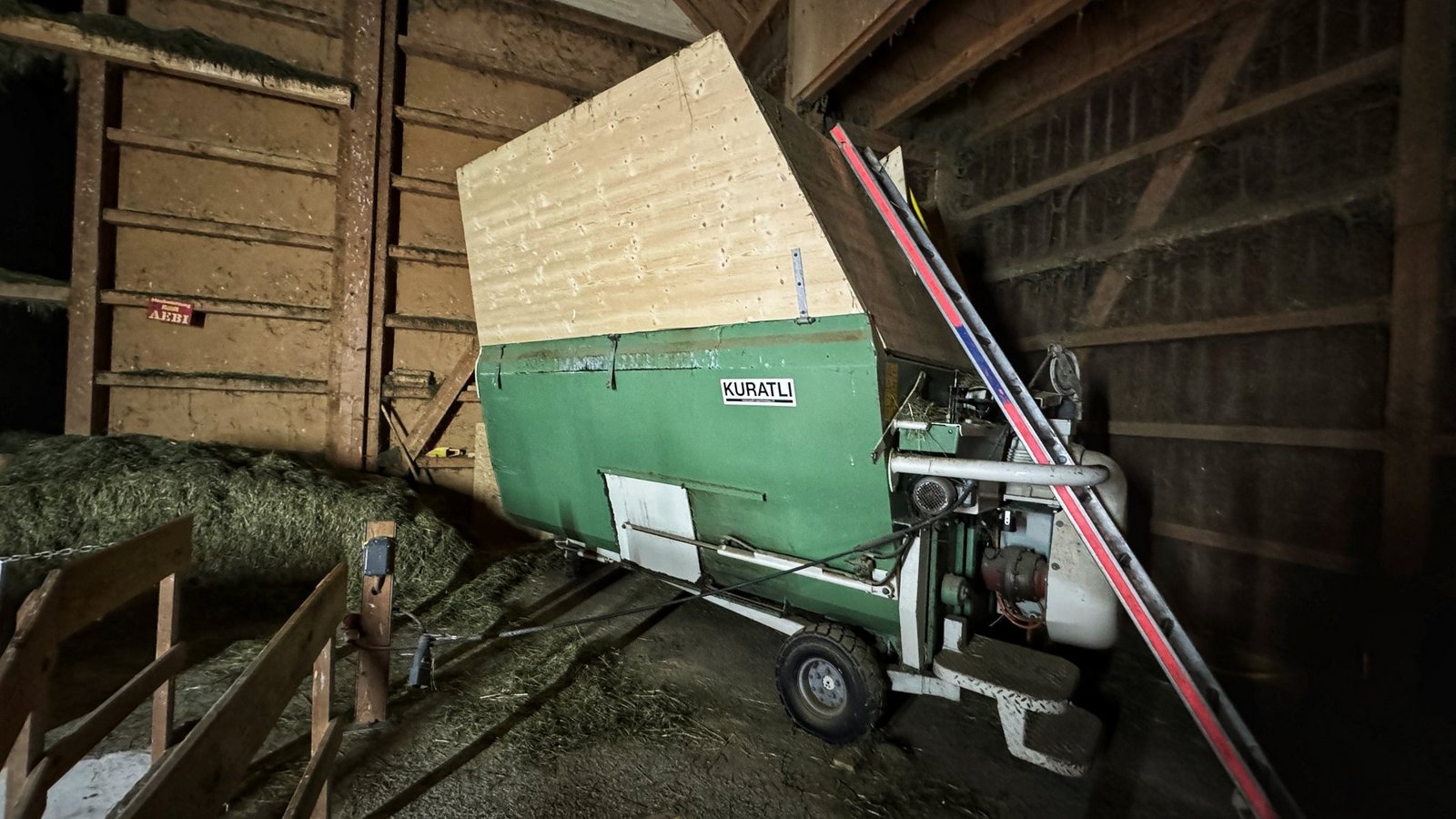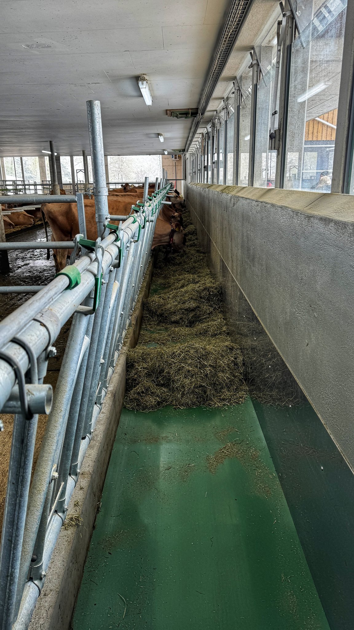Ein besonderer Clou ist das an der Seite anliegende Futterband. Hier können die Kühe das betriebseigene Dürrfutter fressen, gemischt und etwas zerkleinert wird dieses durch den im Heustock stehenden Futtermischwagen, aus diesem fällt es auf das Laufband, welches das Futter verteilt.