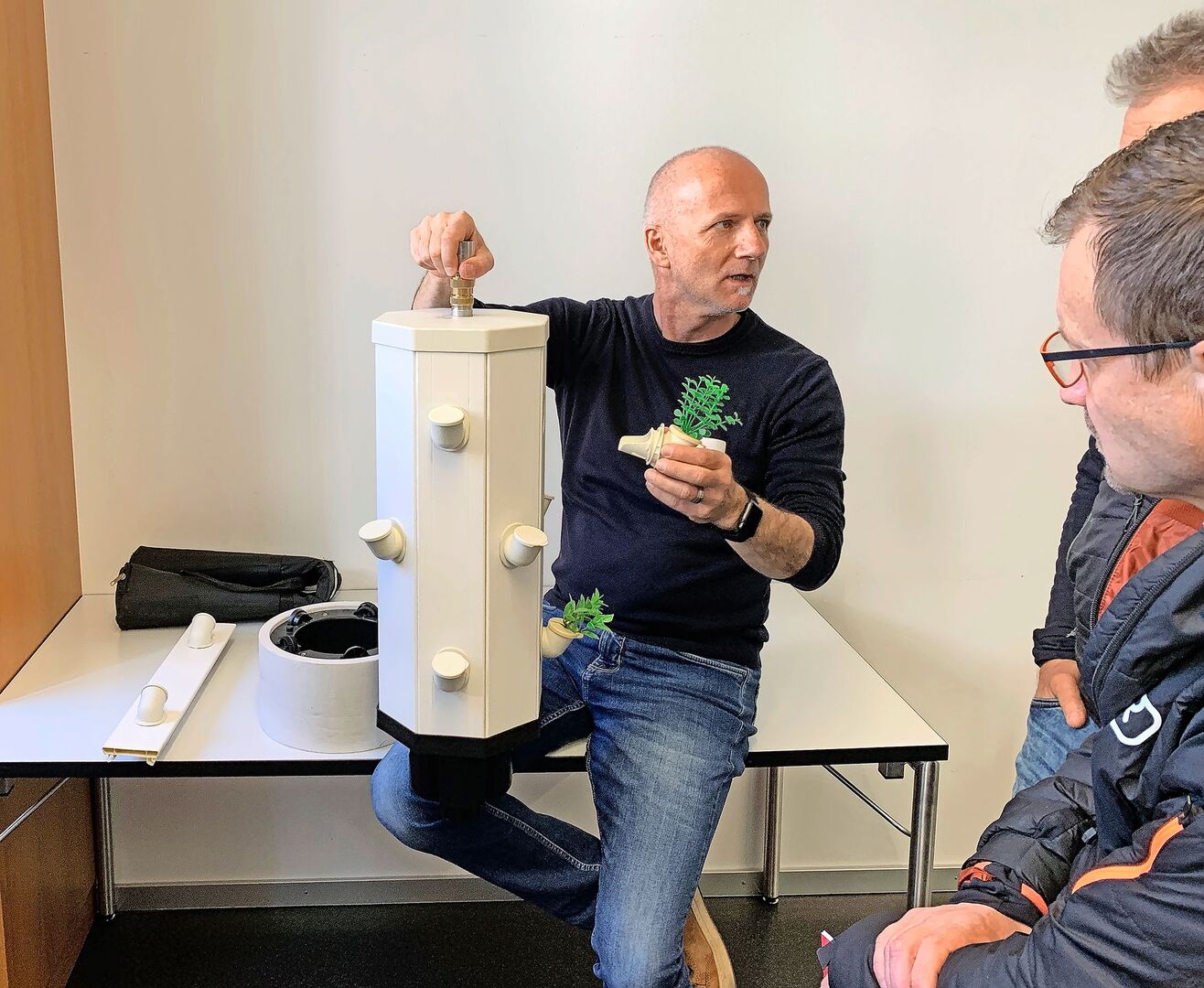Vertikale Landwirtschaft im Gewächshaus: Sascha Rohner vom Ostschweizer Start Up FrugalTec zeigte auf, wie künftig in Gewächshäusern platzsparender und mit höherer Produktivität angebaut werden könne. Zumal der Freilandanbau ja immer anspruchsvoller werde und vertical farming an Bedeutung gewinnt. Entwickelt wird ein rotierendes Turmsystem, woran Gemüse, Kräuter oder Beeren wachsen können. Die mobilen Türme durchlaufen verschiedene Zonen, wie die Bewässerungszone, sodass nicht das gesamte Gewächshaus mit Bewässerungs- und Pflanzenschutzsystemen ausgestattet werden muss. Bereits gibt es mit Farmii solche vertikale Gärten in Turmform auch für den Privathaushalt, drinnen oder draussen.[IMG 2]
