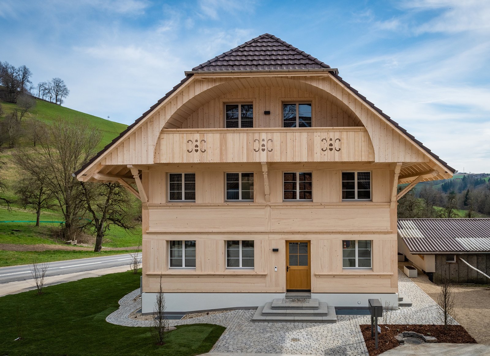 Der Bau hat die Optik eines traditionellen Ständerwerks, ist aber eine hinterlüftete Massivholzschalung. Mit den giebelseitigen Lauben und verzierten Bügen erscheint der Bau als historisches Bauernhaus. Das sei nicht ganz günstig gewesen, aber eine denkmalschützerische Auflage. Der moderne Holzbau vereine Tradition und ein bauphysikalisches Optimum, betont Thomas Wechsler, Geschäftsführer der Dubach Holzbau AG. Die Holzfassade aus Fichtenholz ist dreifach mit einer UV-beständigen Schutzfarbe gestrichen. Der Holzrahmenbau mit eingepresster Zellulosedämmung wurde bereits im Werk in Hüswil vorgefertigt.