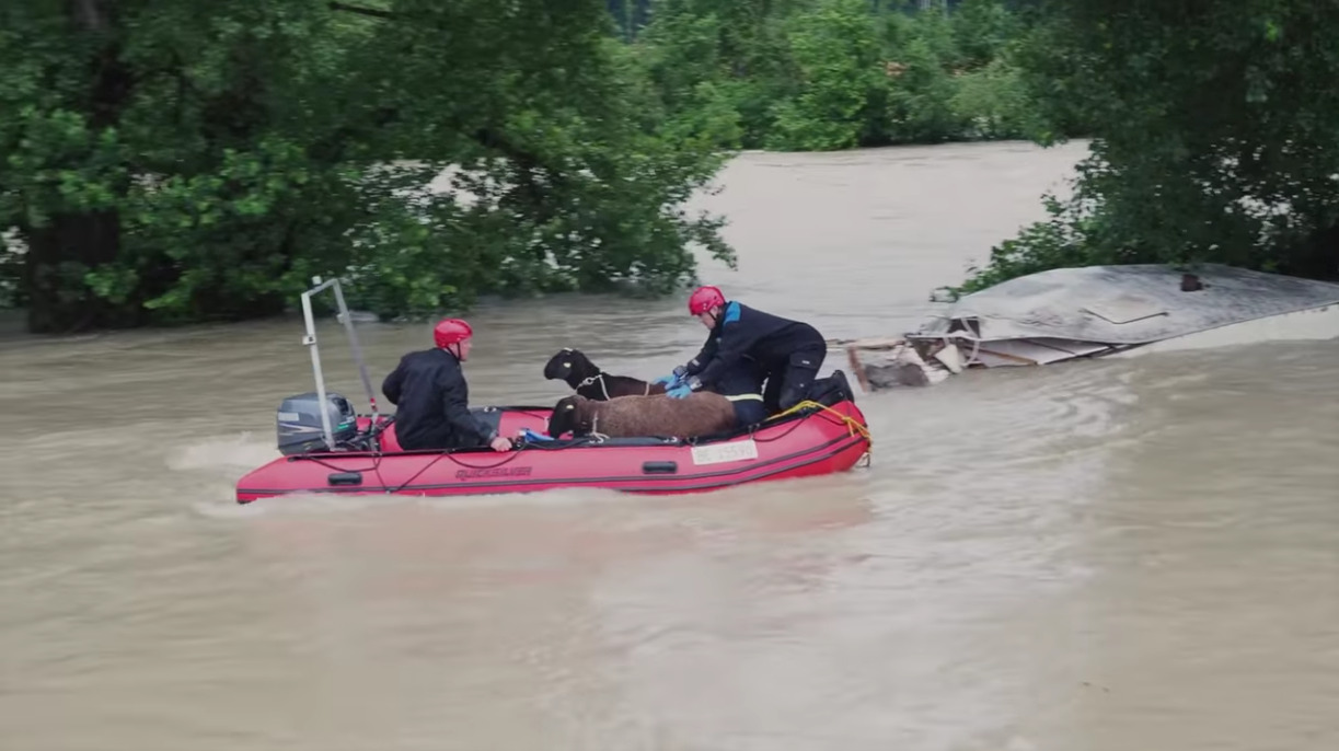 In einer Meldung auf Facebook berichtet Schutz und Rettung Bern von der erfolgreichen Rettung zweier Schafe am Dienstag in der Region Laupen BE. Die Schafe waren auf einer kleinen Anhöhe in einem umgebauten Camper von den Wassermassen umschlossen und wurden von Rettungskräften mit dem Boot an Land geholt.