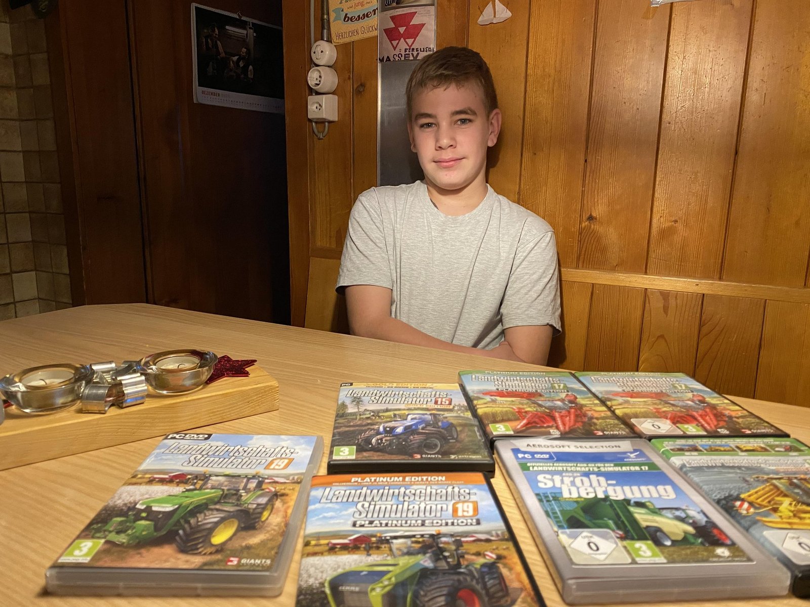 Florian Käsers Freizeit steht ganz im Zeichen grosser Traktoren und anderer Landmaschinen. Eines seiner liebsten Hobbys ist das Zeichnen und es versteht sich von selbst, dass sein liebstes Sujet Traktoren sind. «Je grösser desto besser», lacht er. «Traktoren haben mir schon immer gefallen. Meine Lieblingsmarke ist Massey-Ferguson», bekräftigt der Oberstufen-Schüler. «Im Landwirtschafts-Simulator fahre ich fast nur mit diesen Traktoren herum», fügt er schnell an und holt einen ganzen Stapel Computerspiele hervor. Wie tausenden anderen Jungen in seinem Alter hat es das Bauernhof-Game auch Florian angetan. So verbringt er einen regnerischen Nachmittag gerne auch einmal am PC, wo er eine ganze Flotte von Massey-Ferguson-Traktoren über einen virtuellen Bauernhof dirigieren kann.