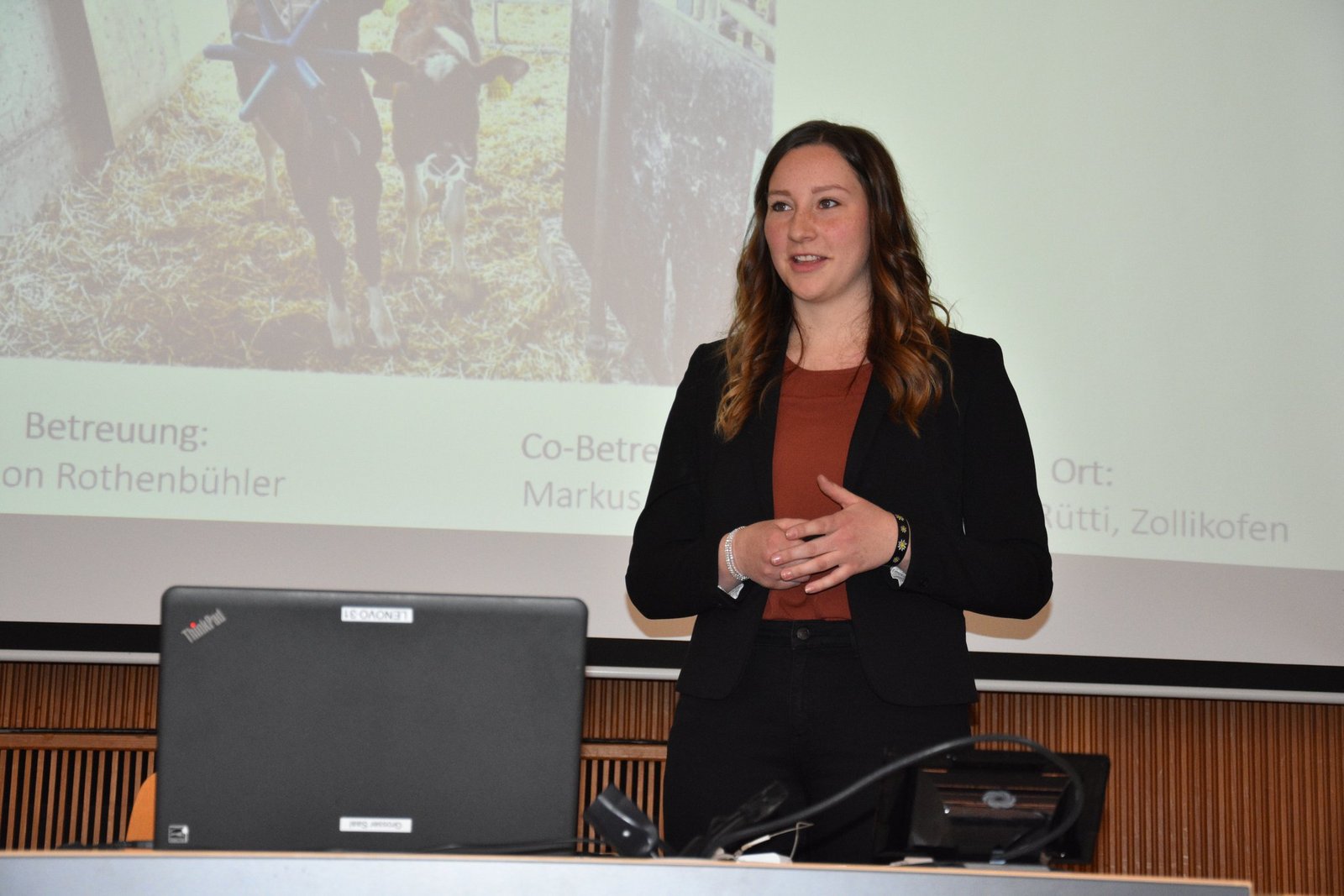 Was die Studierenden alles geleistet haben, zeigte in Vertretung Sandra Glauser, als Sie ihre Diplomarbeit «Erweiterung des Konzepts zur Verminderung des gegenseitigen Besaugens bei Aufzuchtkälber» vorstellte. Die junge Absolventin, welche bei der Firma Melior als Kälberspezialistin arbeitet, konnte aufzeigen, dass es mit einfachen Mitteln möglich ist, das gegenseitige Besaugen der Kälber zu verringern. Auch die beiden Diplomanden Patrick Wampfler und Remo Baumgartner hatten in ihrer Rückschau nur lobende Worte für die Ausbildung übrig.