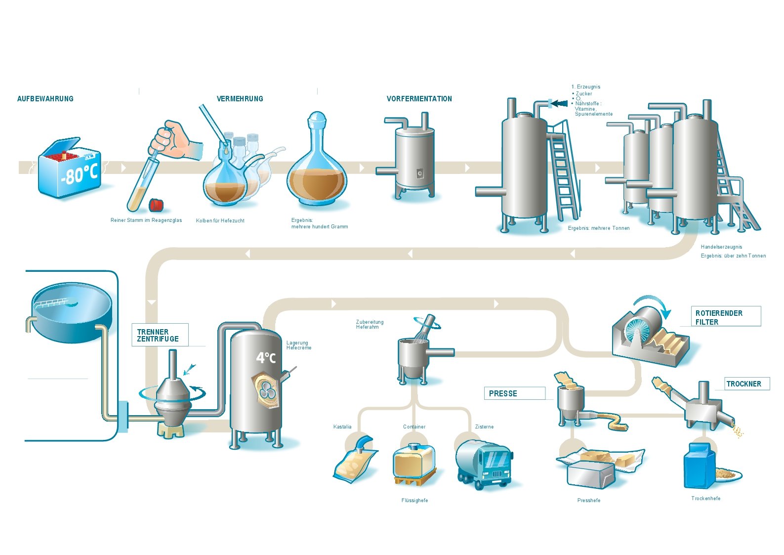Die Klipfel Hefe AG stellt auf ihrer Website den komplexen Weg zur fertigen Backhefe vor. Aus der Hefezucht entstehen durch mehrere Fermentations- und weitere Schritte schlussendlich mehrere Tonnen Hefe. (Bild Klipfel Hefe AG)