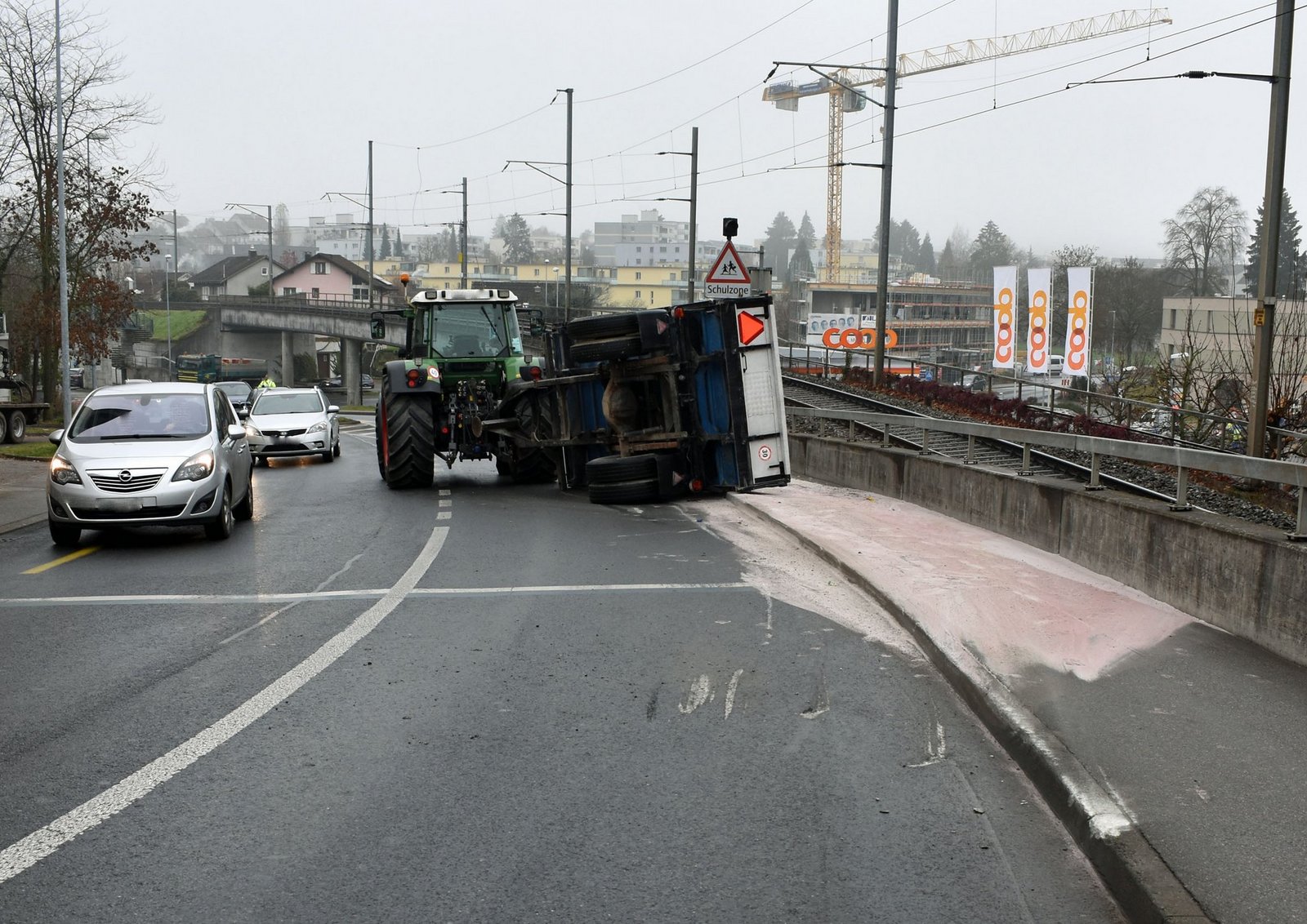 Der Unfall führte zu Rückstau im Mittagsverkehr. Der Sachschaden an der Strasse und dem Anhänger ist laut Communiqué gering.
