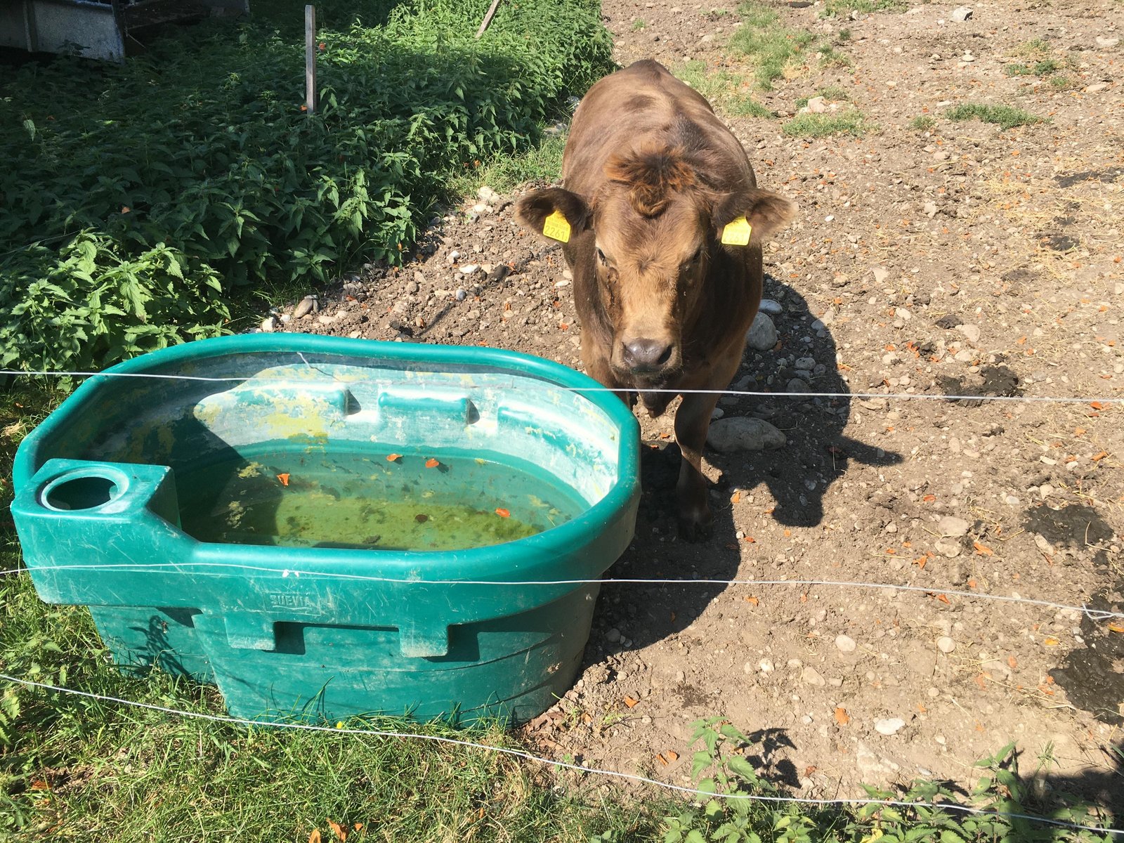 - Unbedingt genügend Wasser bereitstellen: Bei einer Milchkuh mindestens 180 Liter pro Kuh und Tag.