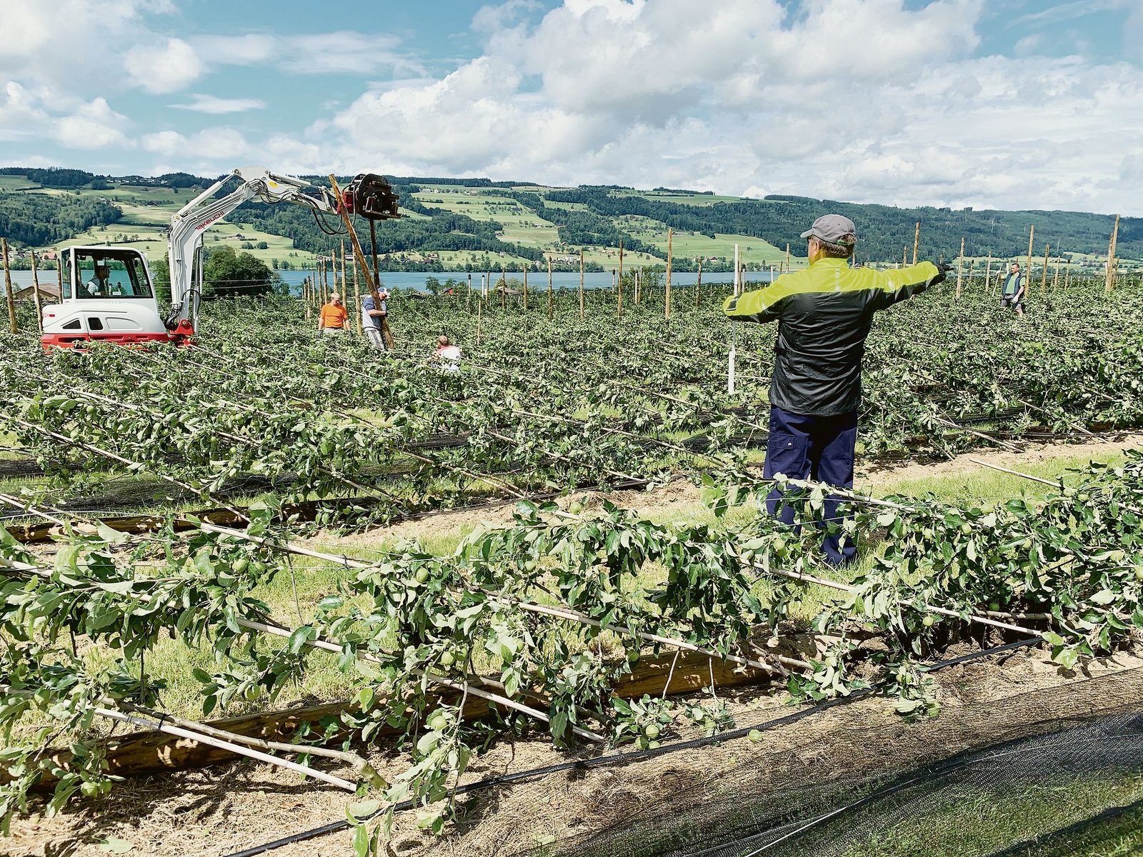 Für Lukas Meyer ist es nach den aktuellen Unwettern der letzten Tage bereits die zweite Obstanlage, die in der Region wieder aufgerichtet wird. Die Firma hat Erfahrung, schon in den 90er-Jahren habe sein Vater nach Schnee- und Hagelschlägen jeweils die Pfähle und Drähte mit Helfern wieder instand gestellt. Erste Priorität habe hier die Rettung der vierjährigen Bäume, in die in den letzten Jahren viel Arbeit gesteckt wurde und die nun in den Ertrag gekommen wären, erklärt Meyer. Es sei ein grosser Vorteil, dass dank des nassen Bodens die jungen Bäume nur umgelegt wurden. Auch die meisten Pfähle sind intakt, werden nun passgenau wieder in die Löcher eingeschlagen, diesmal etwas tiefer.