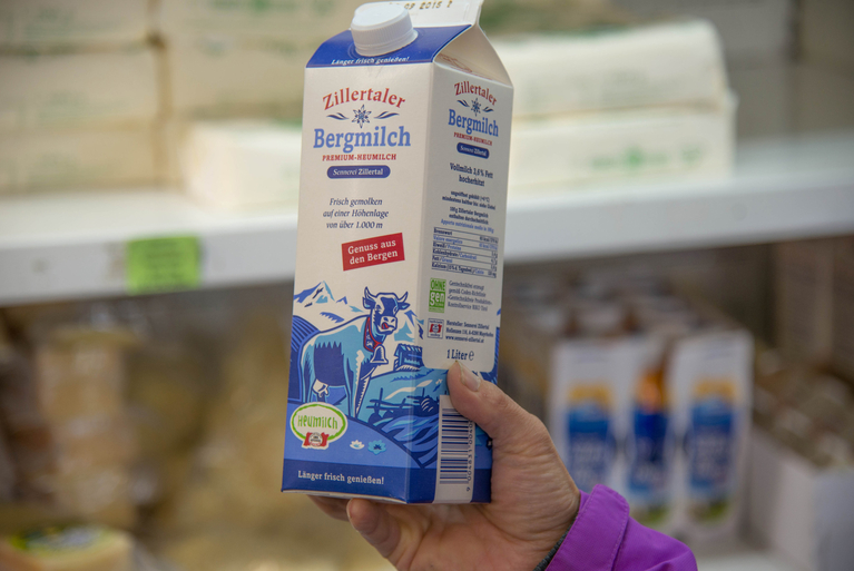 Karl Neuhofer führt uns zu einem typischen Heumilch-Bauernhof ins Zillertal. Johann Hauser bewirtschaftet dort in Stummerberg mit seiner Frau, dem Sohn und dessen Gattin einen Bergbauernhof. Die 100'000 Kilogramm Heumilch der 17 Kühe werden an die Heumilchsennerei in Fügen geliefert. Der Bauernhof ist typisch für das Tirol: Mit 8,5 Hektaren und zusätzlich 22 Hektaren Alm auf dem Berg gegenüber ist er relativ klein, das Gelände stotzig. Die Heumilchproduktion ist eine logische Folge. "90 Prozent der Heumilch kommt von solchen Bergbauern", sagt Obmann Neuhofer.