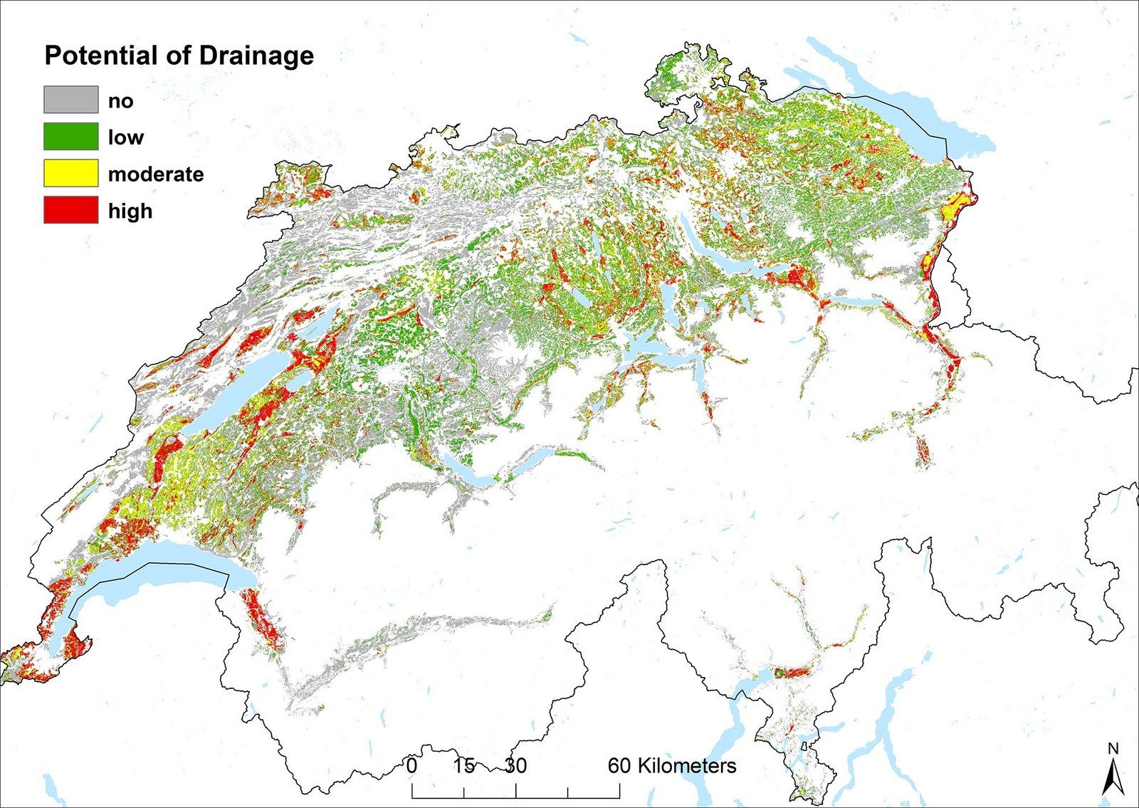 Diese Schätzung kam aufgrund von Bodendaten zustande. Wo der Untergrund zur Vernässung neigt, wurde angenommen, dass er drainiert ist. Eine Karte der effektiv drainierten Flächen gibt es nicht, die oben abgebildete zeigt das geschätzte Potenzial dazu.