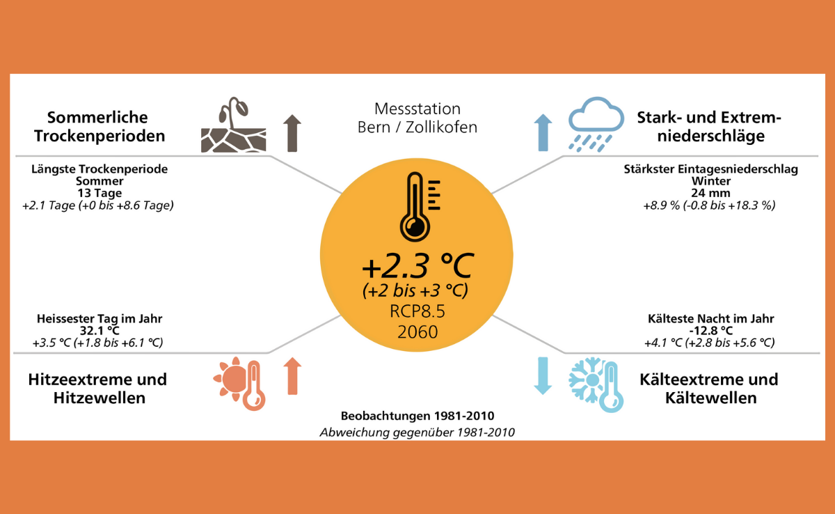 Was die Temperatur der Zukunft angeht, ist meist von Durchschnittswerten die Rede. Dies auch auf globaler Ebene, wo das Pariser Abkommen die Erderhitzung auf durchschnittlich 1,5 Grad begrenzen will. Weitaus heftiger klettern aber die Höchsttemperaturen, schreibt das NCCS: An heissen Sommertagen werde es 2 bis 5,5 Grad wärmer als heute – 40 Grad sind somit nicht mehr weit entfernt. In den Kantonen Genf, Tessin und Zürich sollen Hitzetage in tieferen Lagen bis 2060 ohne Klimaschutz drei- bis viermal häufiger werden.