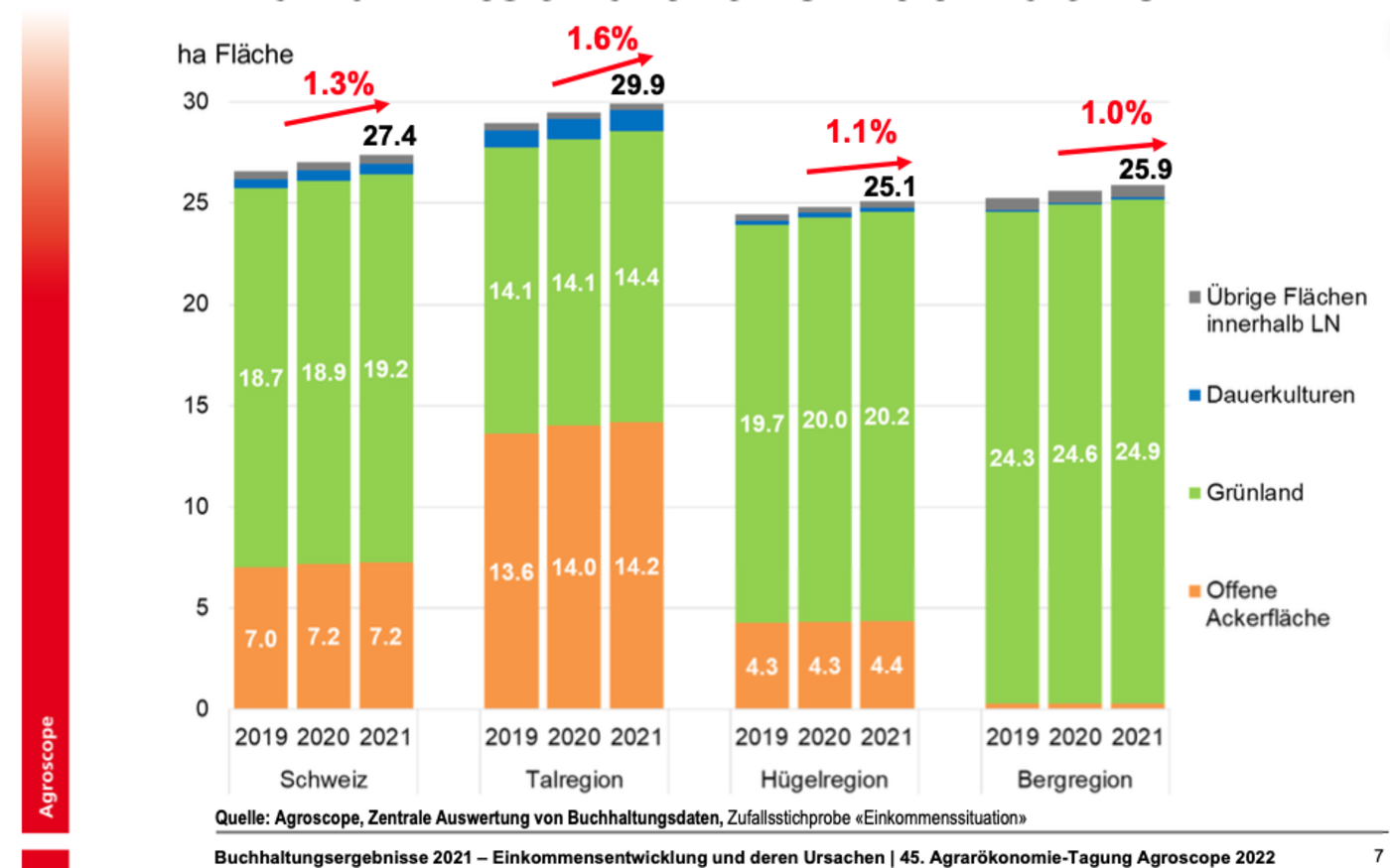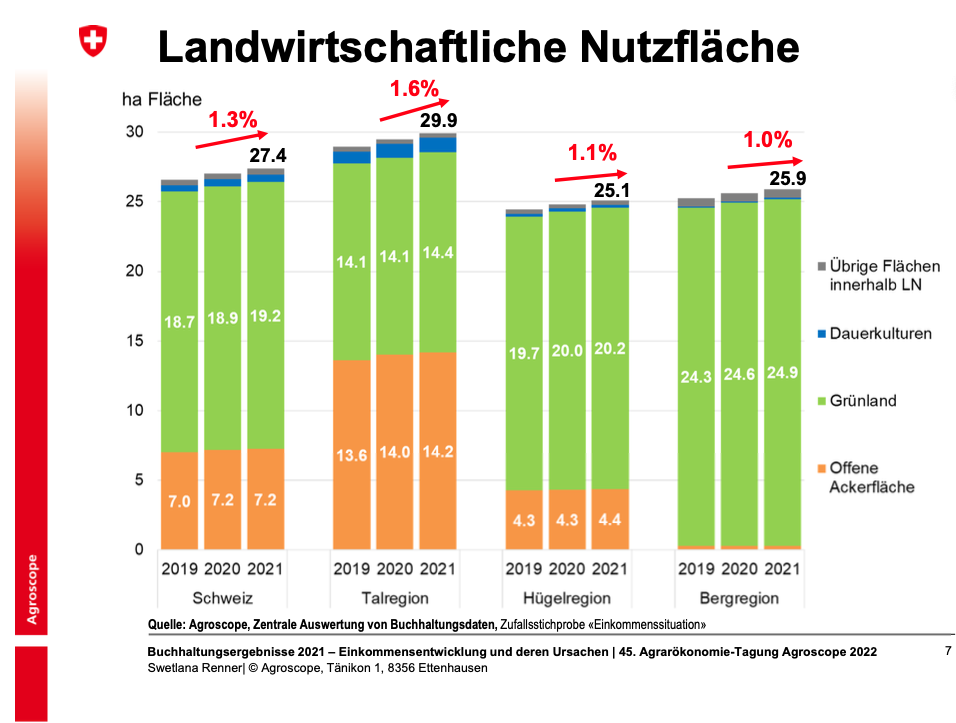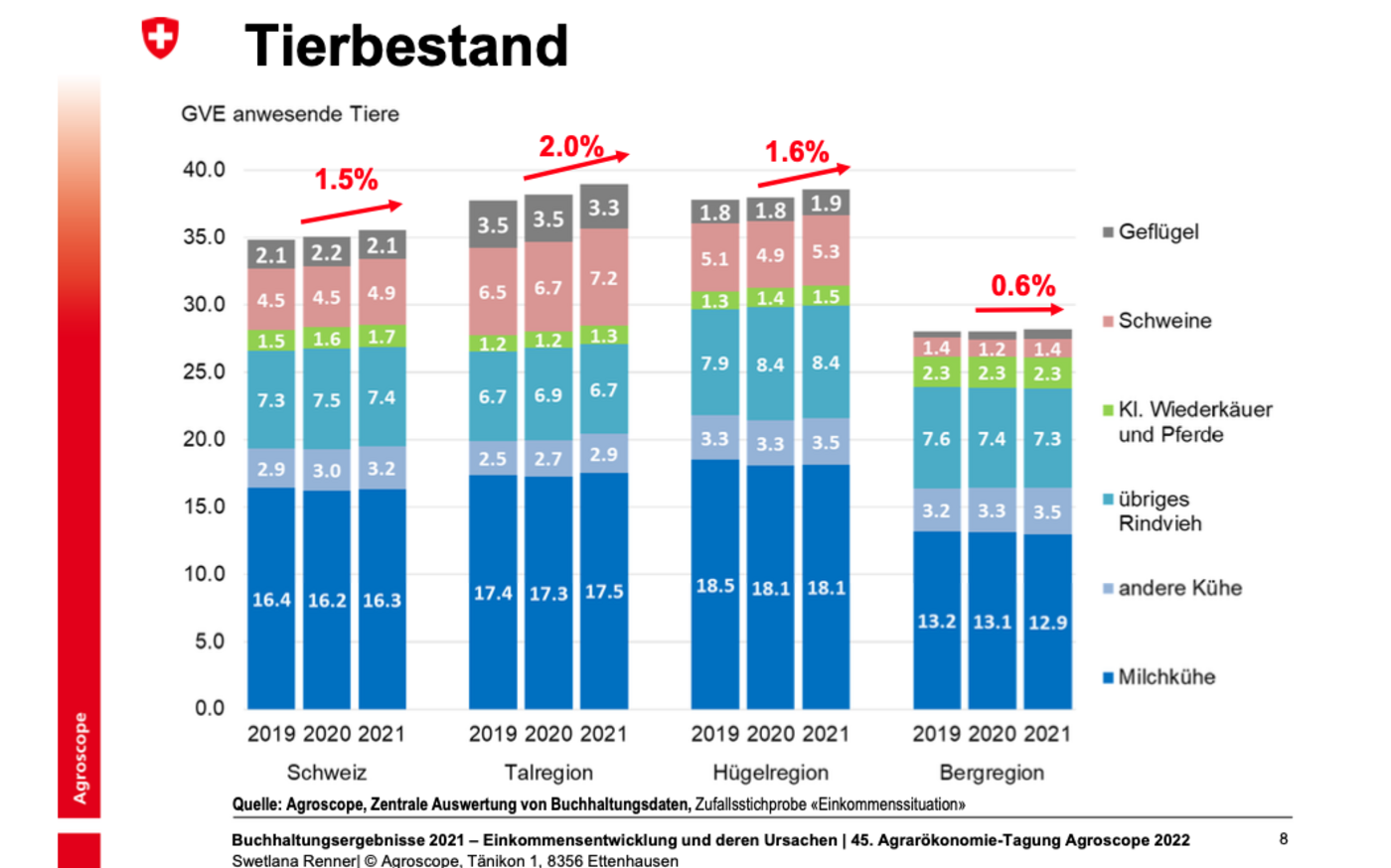 [IMG 4] Die Direktzahlungen pro Betrieb nahmen leicht zu, weil sich der Strukturwandel hin zu flächenmässig grösseren Betrieben fortsetzte. Die landwirtschaftliche Nutzfläche pro Betrieb ist im Schnitt auf 27,4 ha angewachsen. Die höchste Steigerung verzeichneten die Talbetriebe mit 1,6 Prozent auf knapp 30 ha. Auch in den Bergregionen ist ein Anstieg von 1 Prozent zu verzeichnen auf 26 ha, wobei deren Fläche grösser ist als jene in der Hügelzone mit 25,1 ha. Minim gewachsen ist der Tierbestand, nämlich um 1,5 Prozent, und betrug im Schnitt 35,6 GVE, dies bei gleichbleibendem Tierbesatz von 1,3 GVE/ha LN. [IMG 4]