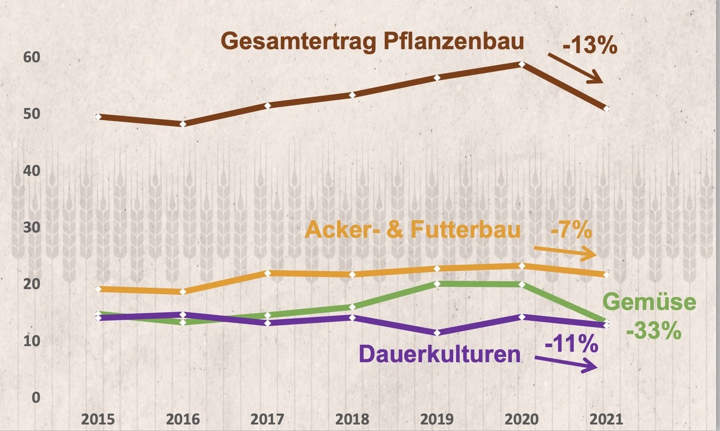 [IMG 2] Einkommen der Bauernfamilien blieb 2021 stabil und betrug im Mittel 80'700 Franken. Gegenüber dem Vorjahr war sogar ein leichter Zuwachs von 1,9 Prozent zu verzeichnen. Das überrascht angesichts der schlechten Ernten von 2021. Insgesamt sank der Gesamtertrag im Pflanzenbau um 13 Prozent. Am stärksten davon betroffen war der Gemüsebau mit sage und schreibe minus 33 Prozent.