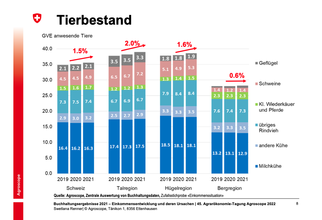 Die gestiegenen Preise für Milch und Rindfleisch und eine hohe Nachfrage nach Eier- und Geflügelhaltung aus Schweizer Herkunft glichen über alle Betriebe den Verlust im Pflanzenbau aus – ebenso konnten die tiefen Preise auf dem Schweinemarkt dadurch kompensiert werden. Dennoch: Für Einzelbetriebe, die sich stark spezialisiert haben, waren die Verluste nicht so einfach aufzufangen.