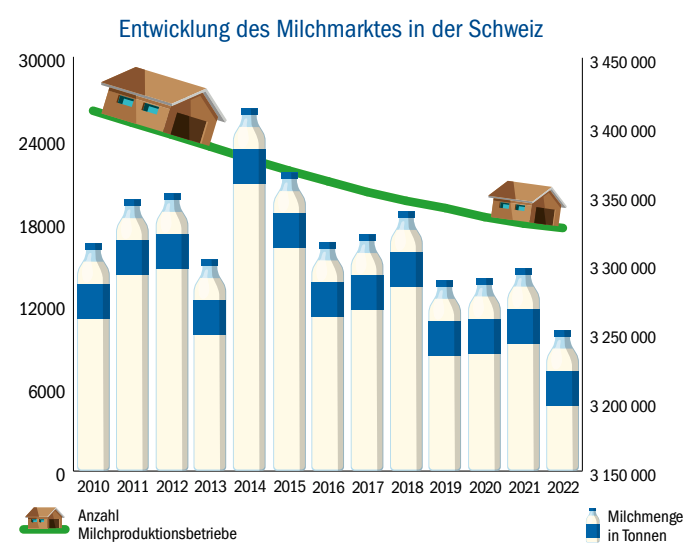 322 Landwirtschaftbetriebe haben im Jahr 2022 die Milchproduktion aufgegeben. Damit geht der Strukturwandel in der Milchproduktion weiter. Die verbliebenen 17 603 Milchproduzenten liefern im Schnitt 184 764 kg Milch ab, 748 kg mehr als im Vorjahr. Mittlerweile liefern 95 Betriebe über 1 Million Kilo Milch ab, 14 mehr als 2021. Auch flächenmässig sind die Milchproduktionsbetriebe gewachsen. So nahm die Fläche innerhalb von einem Jahr um 0,7 Hektaren zu und beträgt nun 29 Hektaren. Vor zehn Jahren waren es fünf Hektaren weniger.