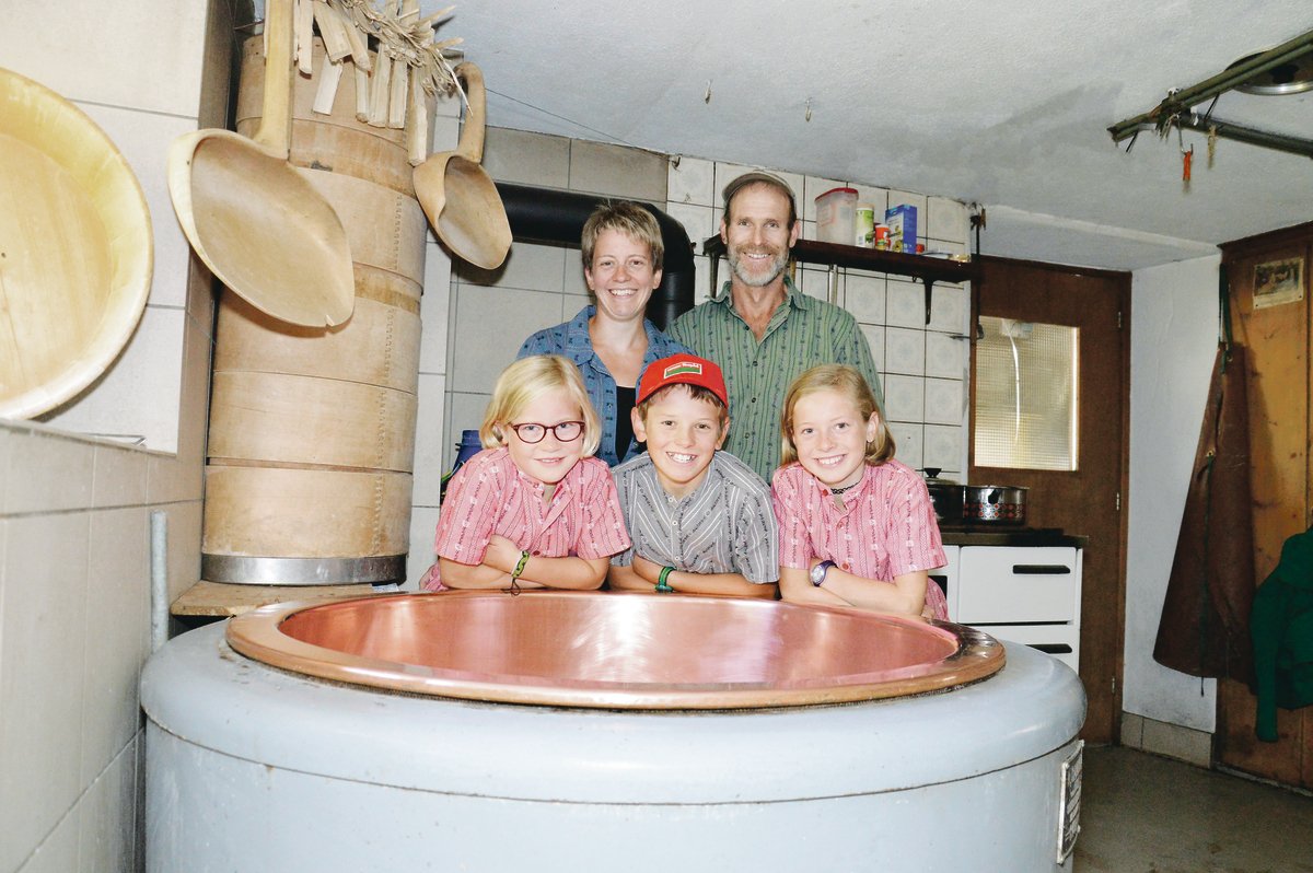 Die ganze Zeit über sind die drei Kinder Marc (12), Sara (11) und Nina (9) nah bei ihren Eltern und horchen gespannt, was diese von ihrer Arbeit erzählen. Den Sommer verbringt die Familie zusammen auf der Alp. Von da aus besuchen die Kinder auch die Schule. «Dort wo das Vieh ist, da wohnen wir», versichern die Fischlis fast unisono. Gut vier Monate seien sie auf den Alpen Änziunen und Rauti. Momentan stellen sie so viel Ziger her, wie sie vermarkten können. Die Restmilch geben sie dem benachbarten Älpler, welcher Glarner Alpkäse AOP herstellt.