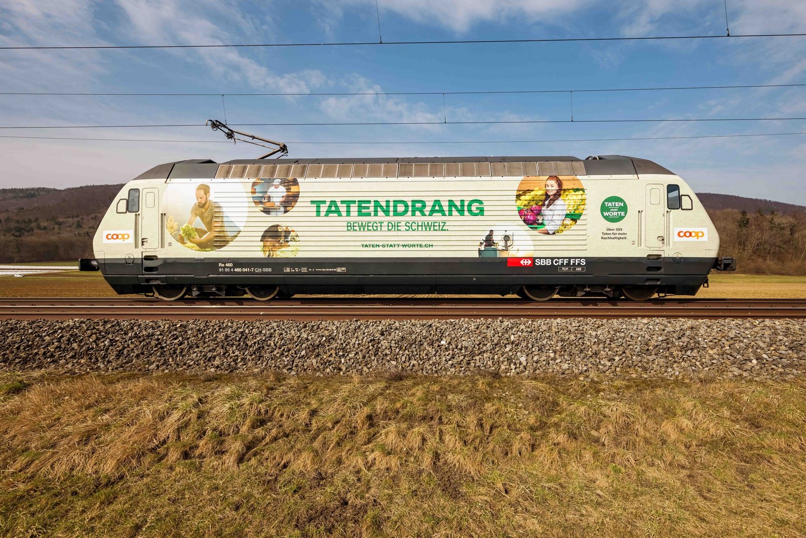 Die neue «Tatendrang»-Lokomotive werde ein Jahr lang auf dem Schweizer Schienennetz unterwegs sein und dabei täglich 1500 Kilometer zurücklegen. Sie soll das Nachhaltigkeits-Engagement beim Güterverkehr verdeutlichen, denn Coop verlagert bereits mehr als zwei Drittel aller Warentransporte auf die Schiene, heisst es in der Medienmitteilung.