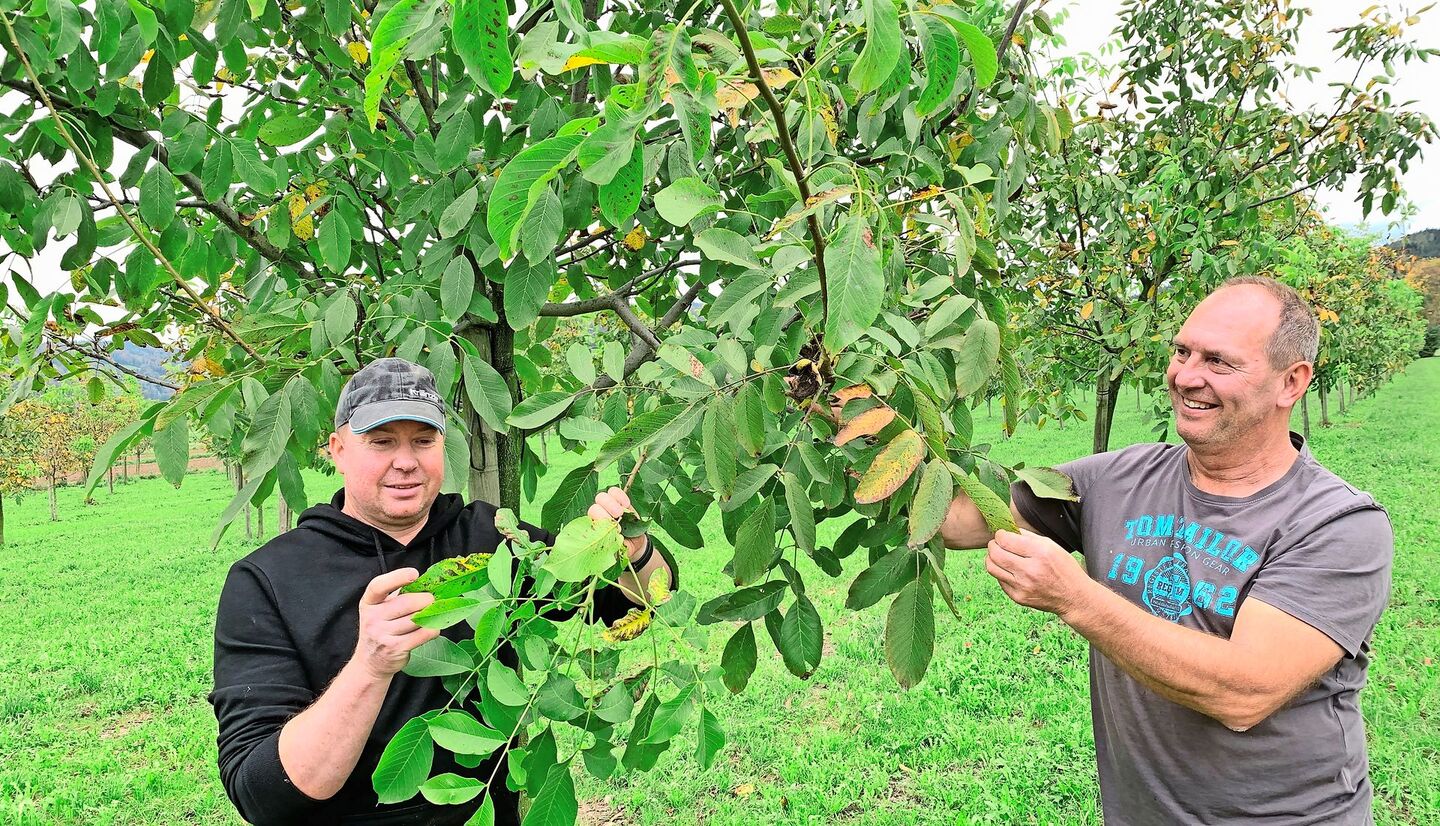 Es sei ein durchschnittliches Nussjahr gewesen, sagt Stefan Meier. Die viele Nässe habe zwar zu weniger ausgetrockneten, dafür volleren Kernen geführt, der Pflanzenschutz sei wegen der Blattkrankheiten aber anspruchsvoll gewesen. Er führt zusammen mit seiner Frau Sabine sowie Urs und Eveline Pfister die 1999 gegründete 20 ha LN umfassende Betriebsgemeinschaft (BG) Meier-Pfister im Eichbühl in Altishofen.