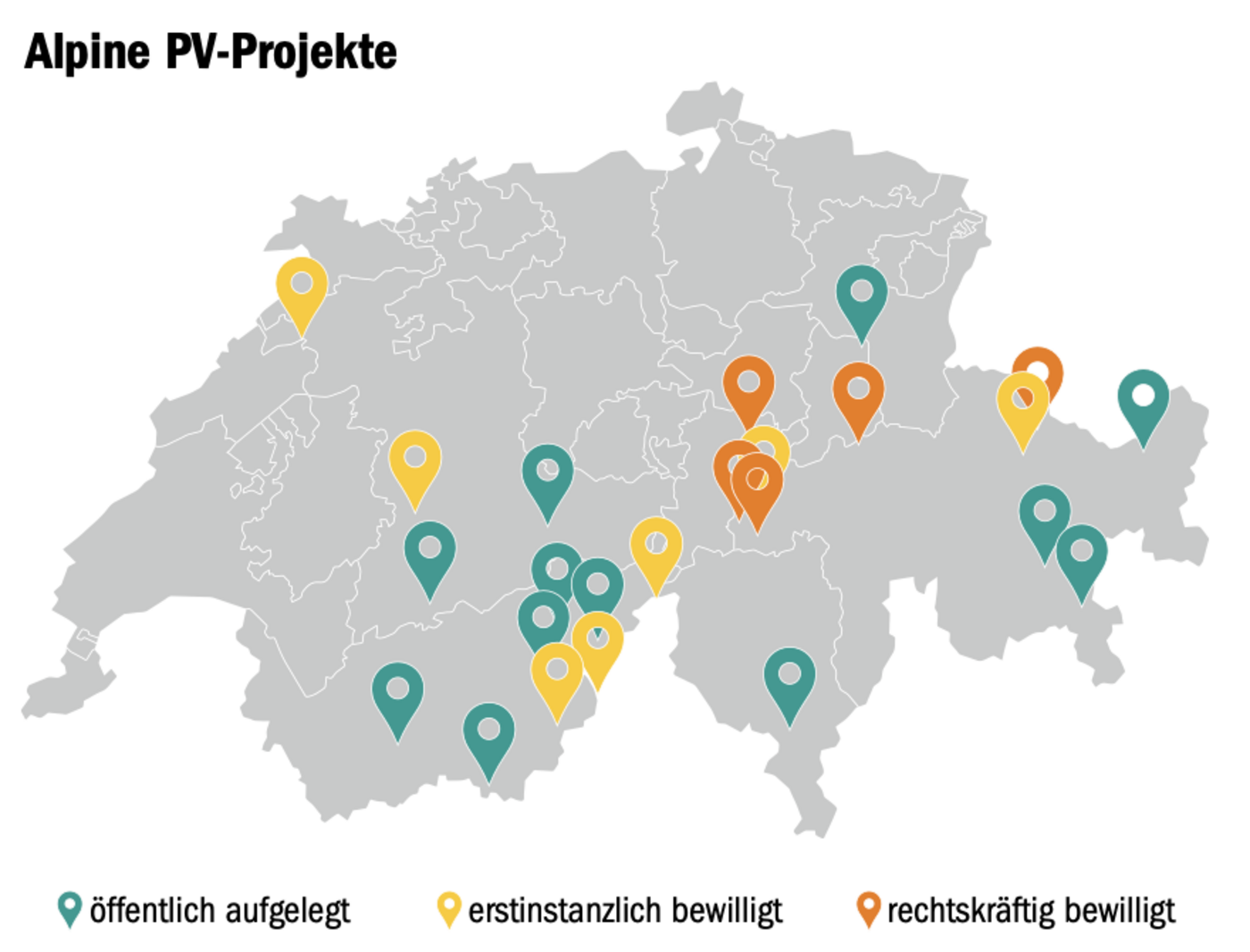 Aus Sicht des Bundes gibt es etwa 240 000 ha prüfenswerte Fläche für alpine PV-Anlagen, was sechs Prozent der Landesfläche entspricht. Die nicht abschliessende Karte des ARE lokalisiert Möglichkeiten vor allem im Westschweizer Jura (Waadt, Neuenburg, Bern, Jura), dem Voralpenbogen mit Chablais (Waadt, Freiburg), im Schwarzenburgerland und Napfgebiet (Bern, Luzern) sowie nordöstlich von Schwyz übers Toggenburg bis ins St. Galler Rheintal und in südexponierten Lagen inneralpiner Täler (Wallis, Waadt, Freiburg, Bern, Obwalden, Uri, Tessin, Glarus und insbesondere Graubünden).