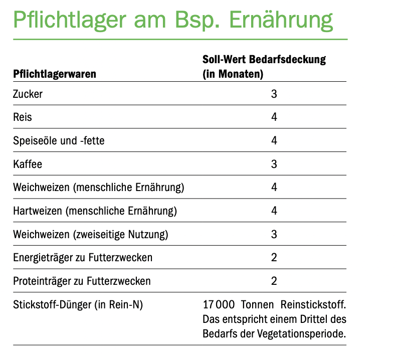 Die Vorratshaltung der aufgeführten Rohstoffe ist obligatorisch. Die Waren müssen für die angegebene Zeitspanne in den Pflichtlagern vorhanden sein.