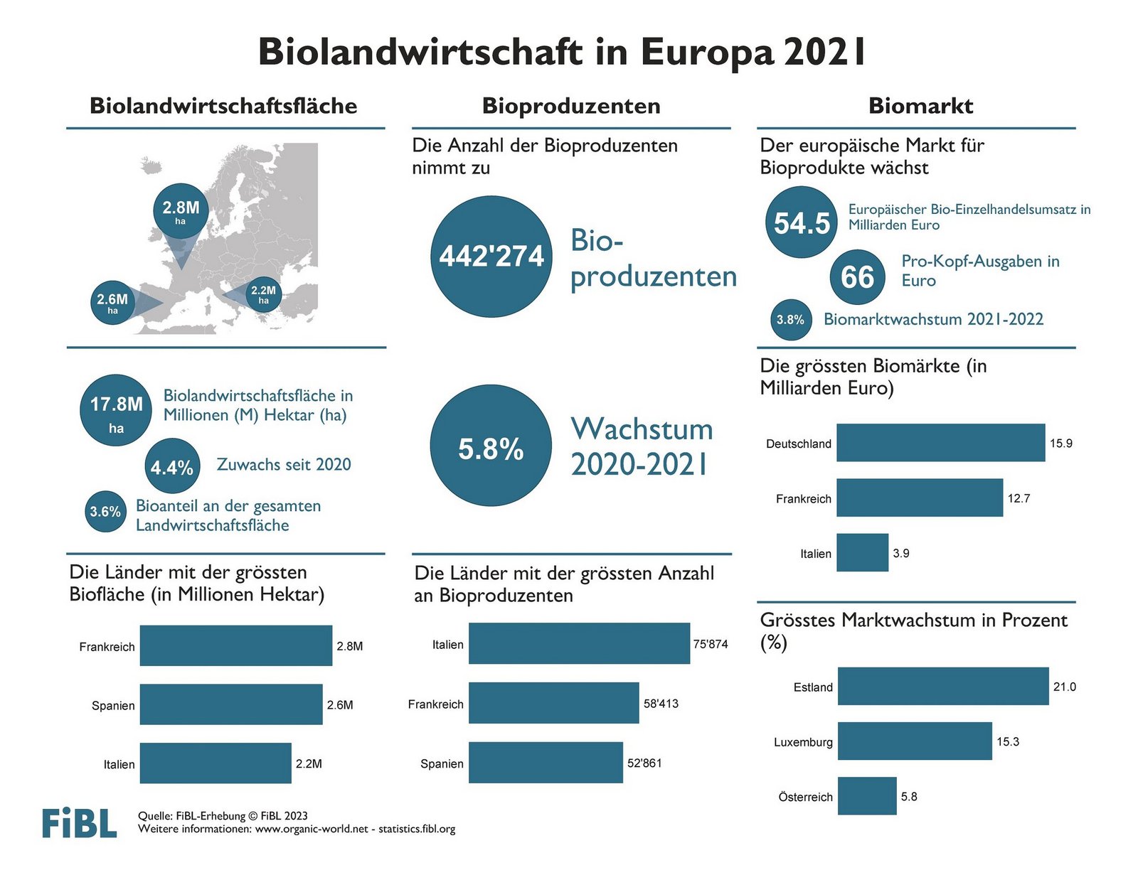 Gemäss dem Bericht wurde im Jahr 2021 in Europa eine Fläche von 17,8 Millionen Hektaren biologisch bewirtschaftet, was einer Zunahme von 4,4 Prozent gegenüber 2020 entspricht. Dieser Zuwachs war etwas geringer als im Jahr 2020.