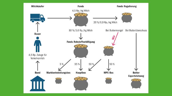 Und was hat die BOM unternommen, damit man nächstes Jahr nicht wieder so viel Butter importieren muss? Dafür hat sie die Schoggigesetz-Nachfolgelösung etwas angepasst, wie in der unten stehenden Grafik zu sehen ist. Zur Erinnerung: Das Schoggigesetz hilft, dass Verarbeiter Schweizer Rohstoffe verwenden.