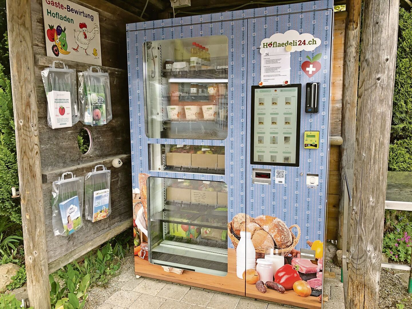Verkaufsautomaten müssen nicht zwingend auf dem Hof stehen, sie können grundsätzlich auch an einem belebten, zentralen Ort betrieben werden. Diese Möglichkeit ist vor allem für Betriebe interessant, die abseits gelegen sind. So gibt es einen Trend, den Hofladen dorthin zu bringen, wo die Kundschaft sowieso anzutreffen ist. Das heisst, an belebten Standorten oder direkt in der Stadt, wo die meisten Konsumenten leben und arbeiten. Ein Pionier diesbezüglich ist der «Alpomat», ein Pilotprojekt der Kleinbauern-Vereinigung und der Bauernfamilie Abderhalden aus Gibswil ZH: Seit Herbst 2018 stehen in verschiedenen Quartieren der Stadt Zürich Verkaufsautomaten, welche rund um die Uhr zugänglich sind. Beliefert werden sie von regionalen Bauernbetrieben und kleinen Verarbeitern mit Produkten wie etwa Käse, Butter und Trockenfleisch.