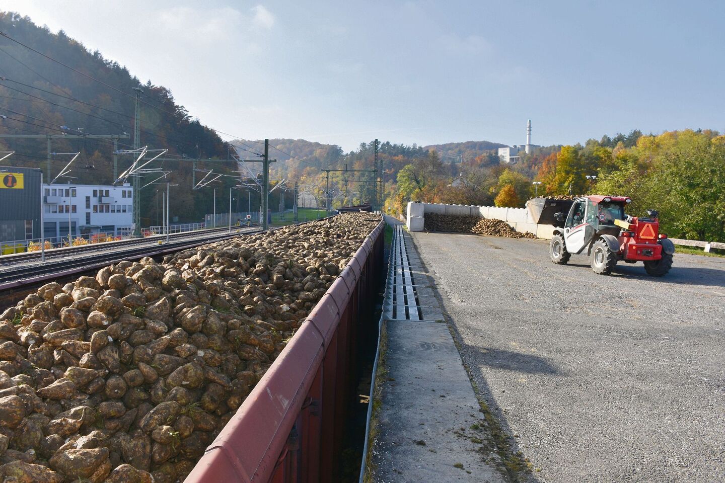 Dann ging es zügig: Die Bauern brachten die Rüben von den Feldern und kippten sie an der Rampe ab, wo sie der Barzheimer Landwirt Urs Winzeler mit dem Radlader in die Waggons füllte. Andere kippten ihre Rüben vom Anhänger direkt in die Bahnwagen. Um 12 Uhr waren die ersten Waggons geladen. Bis die Wagen in Schaffhausen ausgetauscht waren, dauerte es wieder zweieinhalb Stunden. Das Verladen ging weiter. Zwischendurch warteten die Männer nochmals eine Dreiviertelstunde, bis der Zug rangieren konnte. «Bei diesem Wetter hätte ich auch noch andere Arbeit», schimpfte ein Bauer. Es war schliesslich dunkel, bis der Zug mit 1100 Tonnen Zuckerrüben nach Frauenfeld abfuhr.