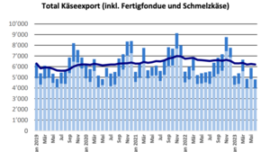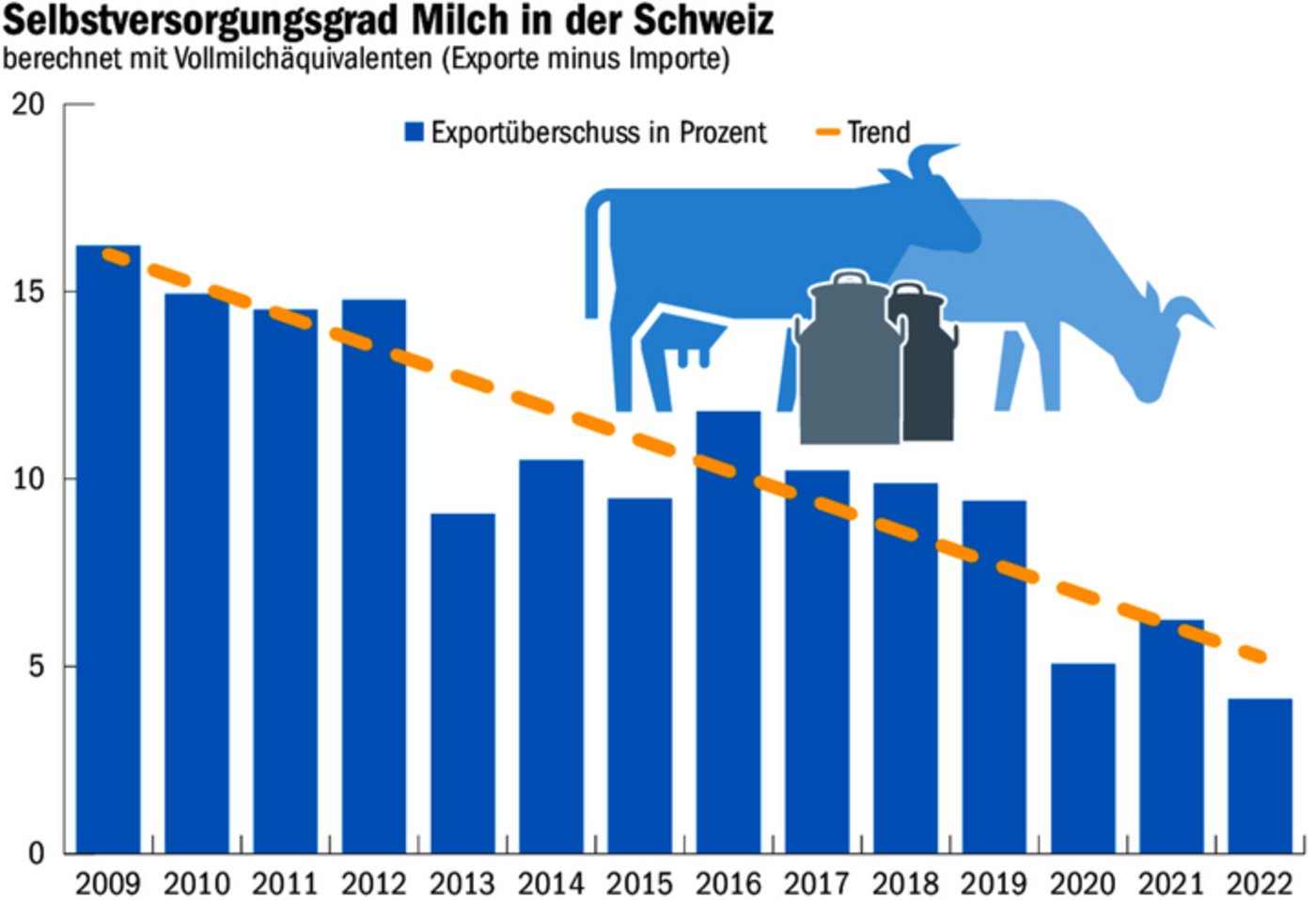 Der Selbstversorgungsgrad bei der Milch hat in den vergangenen Jahren abgenommen. Die Betrachtung erfolgt auf der Basis von Milchäquivalenten (VMA). Ein VMA entspricht 1 kg Kuh-Vollmilch. Dabei sind Verluste bei Verarbeitung (z. B. Schotte) und Handel berücksichtigt. Der Exportüberschuss betrug 2022 noch 4 % der im Inland vermarkteten Milchmenge. Für die weitere Entwicklung des Selbstversorgungsgrades sind die Höhe der Milchproduktion und die Milchgehalte, der Konsum, die Entwicklung der ständigen Wohnbevölkerung, die Entwicklung beim Tourismus und der Kurzaufenthalter sowie die Entwicklung der Importe von Milch und Milchprodukten wie auch der Einkaufstourismus relevant
