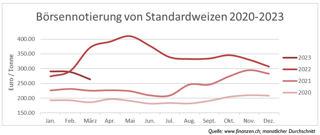 Anfang März fielen die internationalen Weizenpreise in Amerika und Europa weiter. So tief, wie dies seit 18 Monaten nicht mehr der Fall war. Zurzeit liegen die Preise bei noch knapp 260 Euro pro Tonne. Dafür gibt es zwei ausschlaggebende Gründe. Zum einen wurde eine Verlängerung des Getreide-Abkommens zwischen Russland und der Ukraine ausgehandelt, so dass Getreide aus der Ukraine weiterhin sicher über den Korridor der Schwarzmeerhäfen in alle Welt exportiert werden kann. Dafür hatten sich hochrangige russische Abgeordnete mit UN-Beauftragten in Genf getroffen. Die Verlängerung ist nur für 60 Tage vorgesehen, statt der ursprünglich geplanten 120 Tage, aber die Preise auf den Weltmärkten sind in der Folge nicht gestiegen.