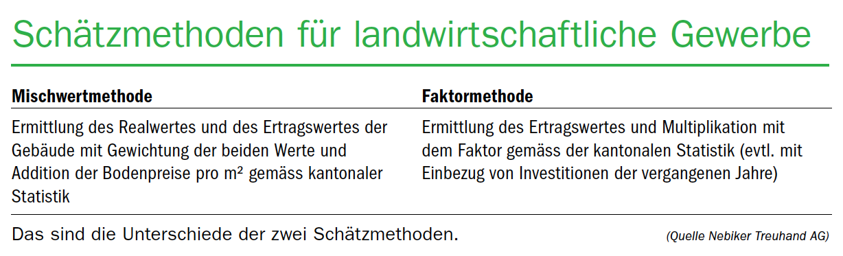 Diese beiden beschriebenen Schätzmethoden können für denselben Betrieb sehr unterschiedliche Werte ergeben. Um keine allzu grossen Differenzen zu erhalten, gibt es darum auch Kantone (z. B. SO), welche die eine Methode anwenden und die andere als Kontroll- und allenfalls Korrekturmassstab nutzen.