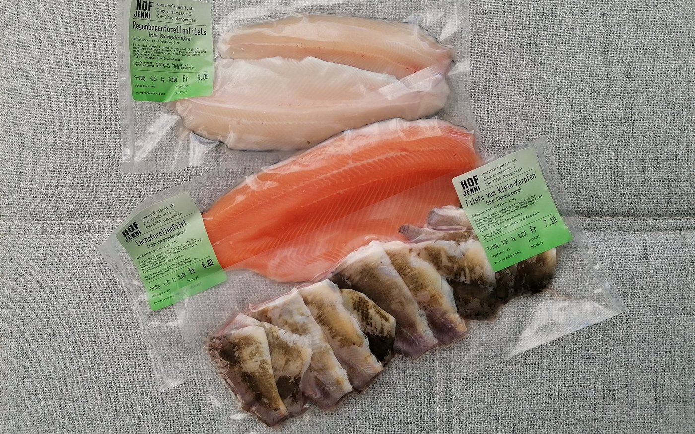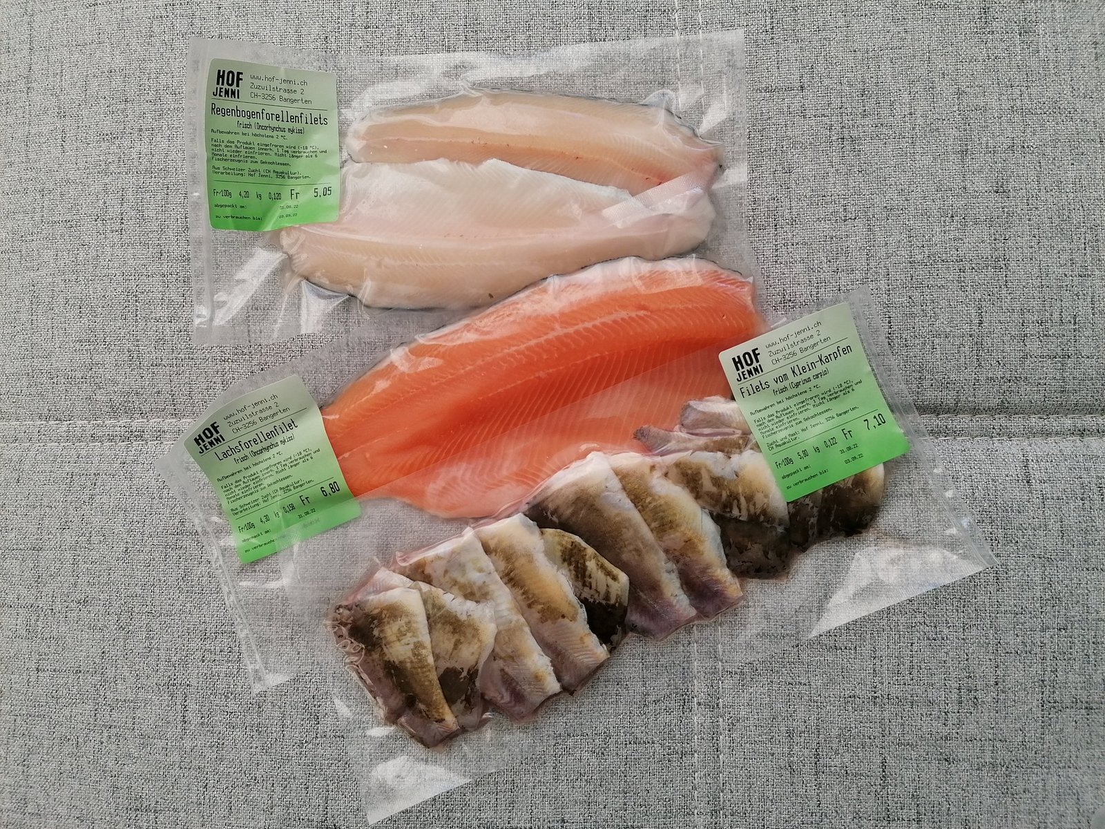 Im Angebot des Online-Shops der Familie Jenni hat es Karpfen-Filets, die für Fr. 5.80 pro 100 g zu haben sind, sowie Regenbogenforellen-Filets für 3.80 Fr. pro 100 g und Lachsforellen-Filets für 4.30 Fr. pro 100 g. Ausserdem sind ganze Fische und bei den Forellen auch geräucherte Stücke bestellbar, die Niklaus Jenni selber auf dem Hof herstellt. Er hat die Ausbildung zum Fischwirt in Deutschland abgeschlossen, die gleiche Ausbildung, die auch Schweizer Berufsfischer absolvieren.
