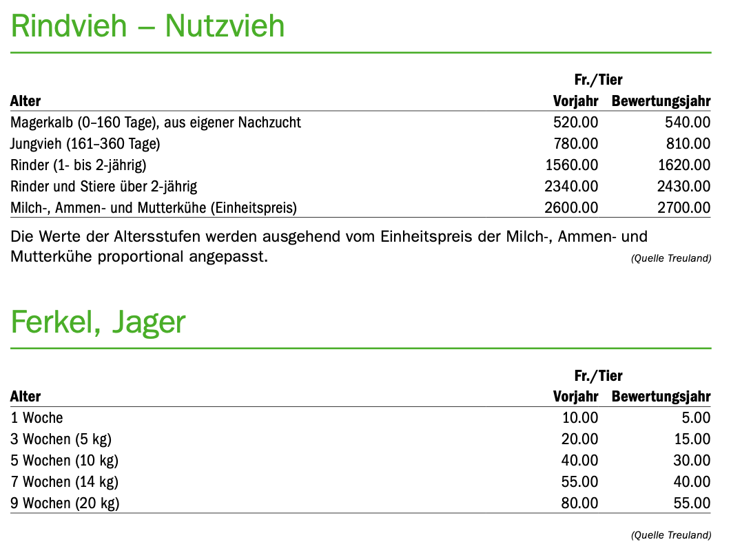 Insbesondere der Viehbestand wird aufgrund deutlich höherer Marktpreise höher bewertet. So gelten Milch-, Ammen- und Mutterkühe 2700 Franken, 100 Franken mehr als vor einem Jahr. Ebenfalls Kälber und Grossvieh gelten aufgrund anhaltend hoher Schlachtviehpreise deutlich mehr als vor einem Jahr. Umgekehrt ist es bei den Schweinen. Hier hält die Krise weiterhin an, entsprechend werden auch die Tiere im Inventar nun tiefer bewertet. Die Bewertung erfolgt aufgrund des zu erwartenden Verkaufserlöses minus fünf Prozent für Risiko und Vermarktung.
